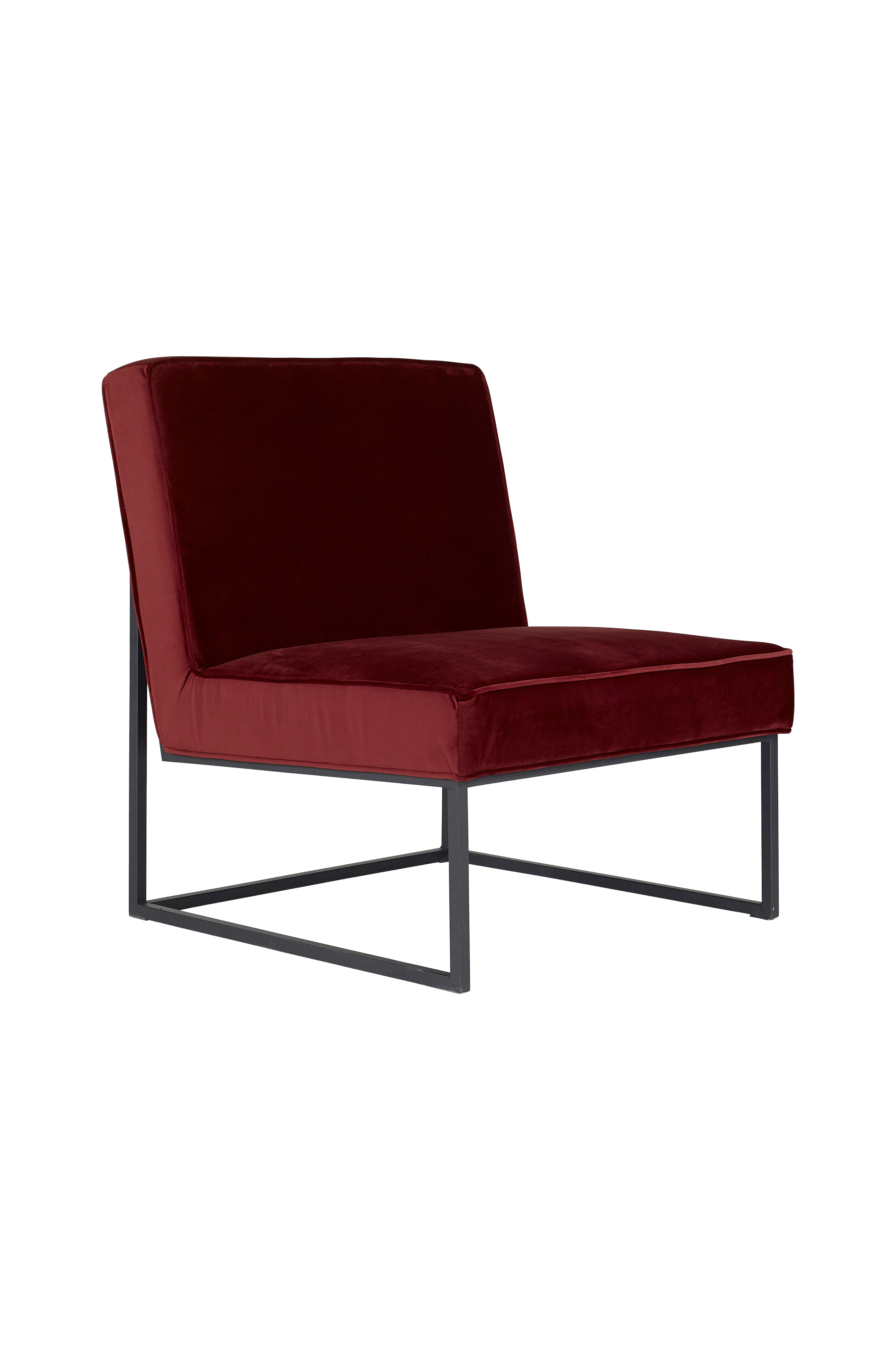 Solid, bred lenestol med metallstamme. Trekk i myk polyesterfløyel og fyll av polyeter. Gummibånd i setet. Høyde 84 cm, bredde 75 cm, dybde 79 cm. Sittehøyde 43 cm, sittedybde 57 cm. Montert.