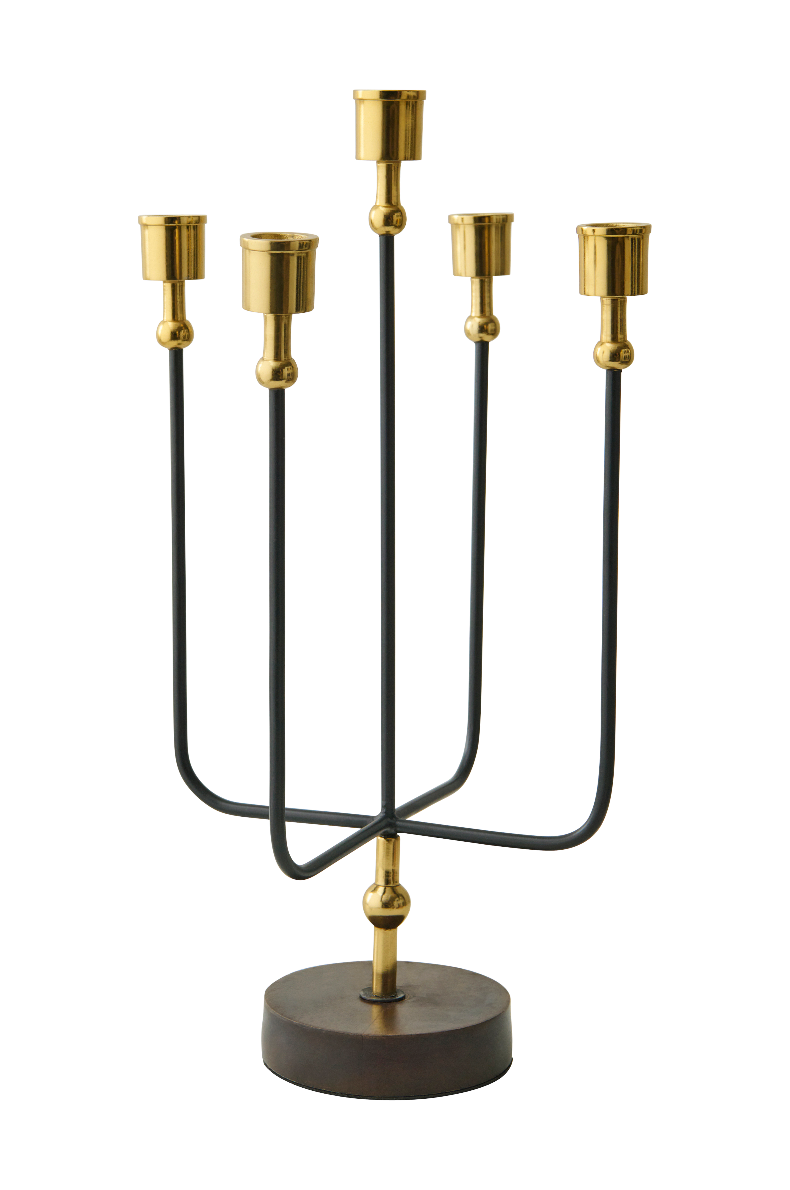 5-armet lysestake av metall med fot av tre.