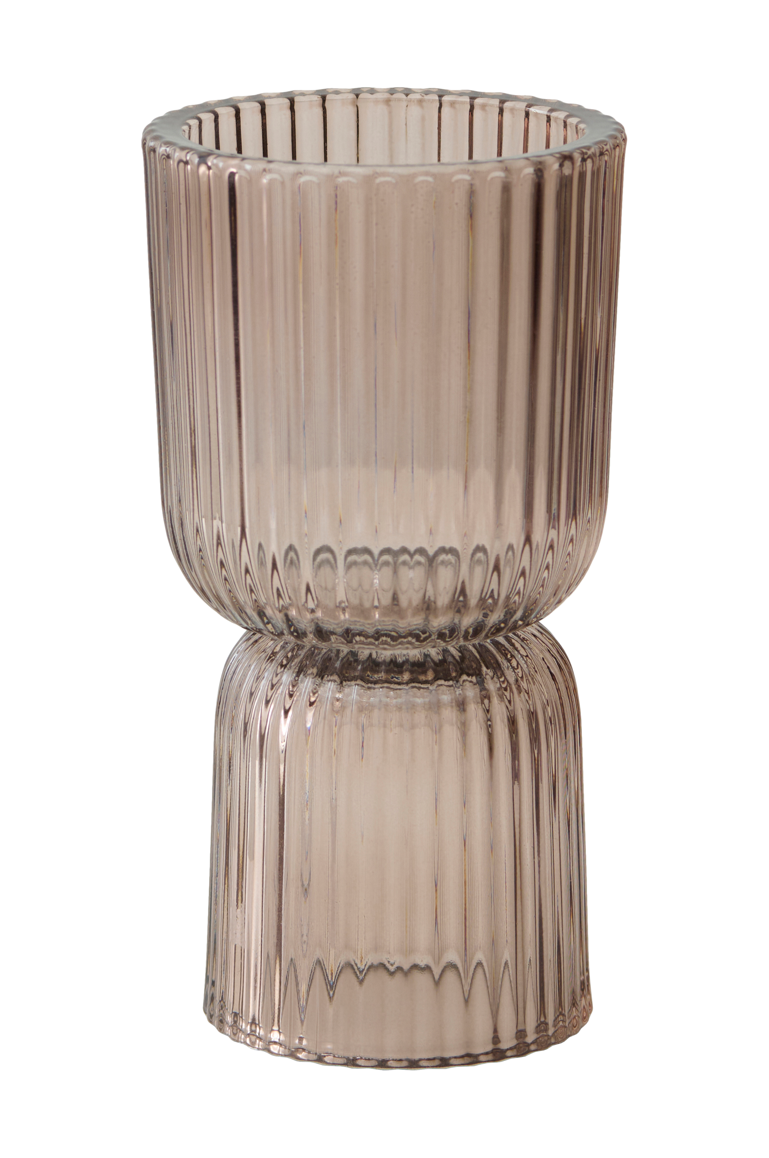 Lyslykt i glass med rillet teksturmønster. Diameter øverst 9 cm, diameter nederst 7,5 cm.