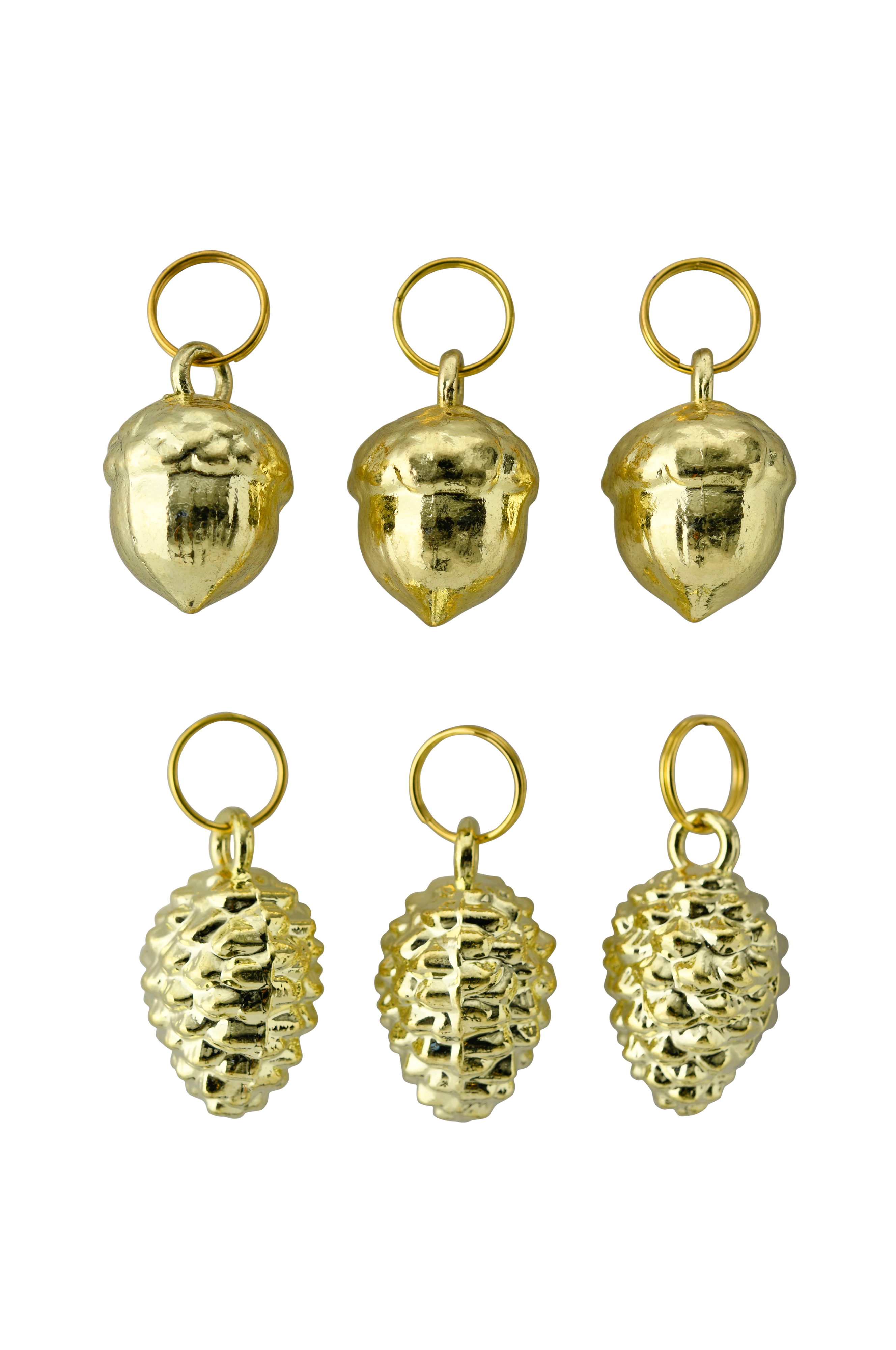 6 stk. pakkedekor av gullfarget metall. Høyde ca. 3 cm.