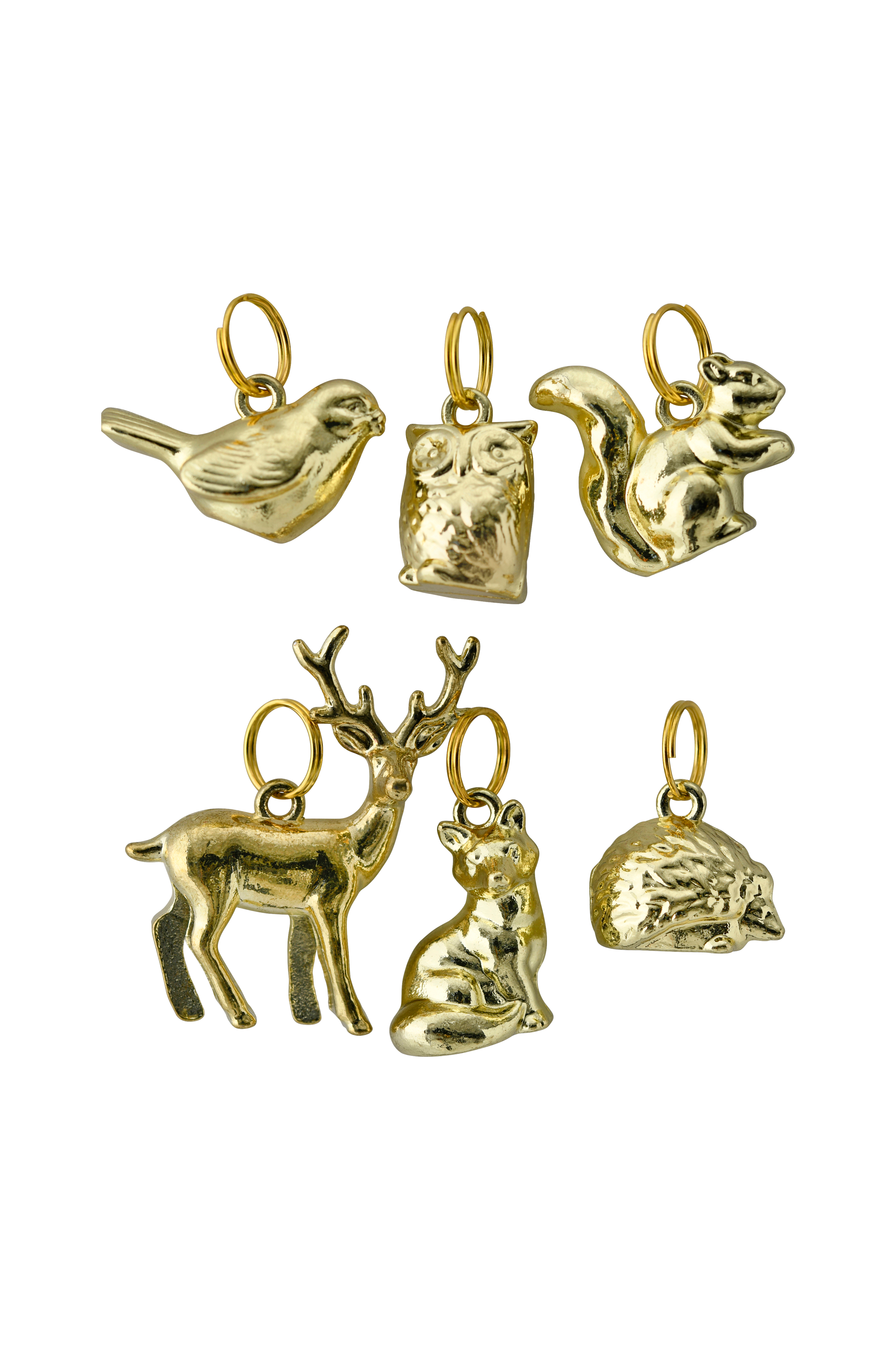 6 stk. pakkedekor av gullfarget metall. Høyde ca. 3 cm.