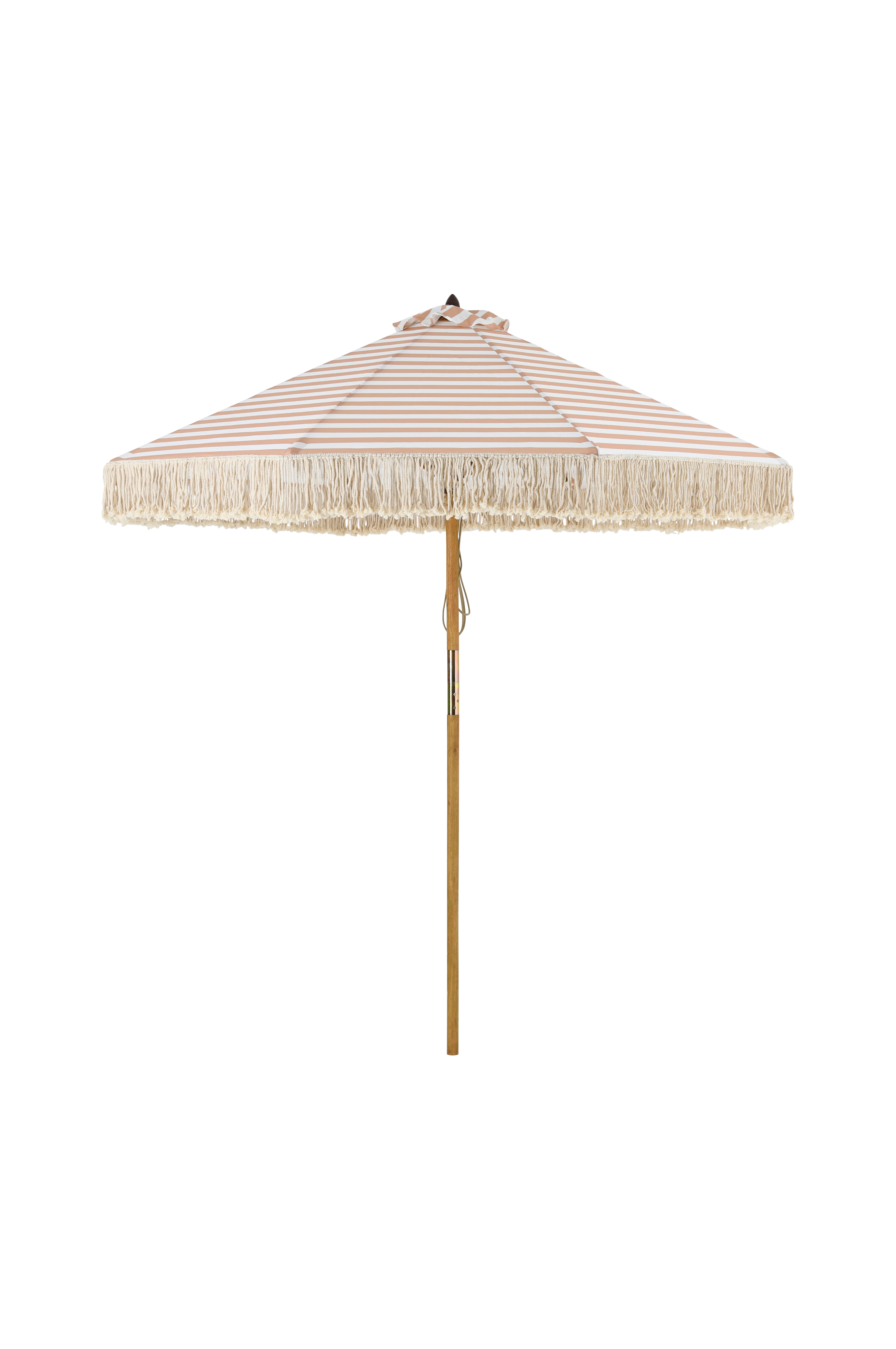 Parasoll i stripete stoff. Kant i makramé med frynser i bomull. Stang av tre. Høyden er ikke justerbar.