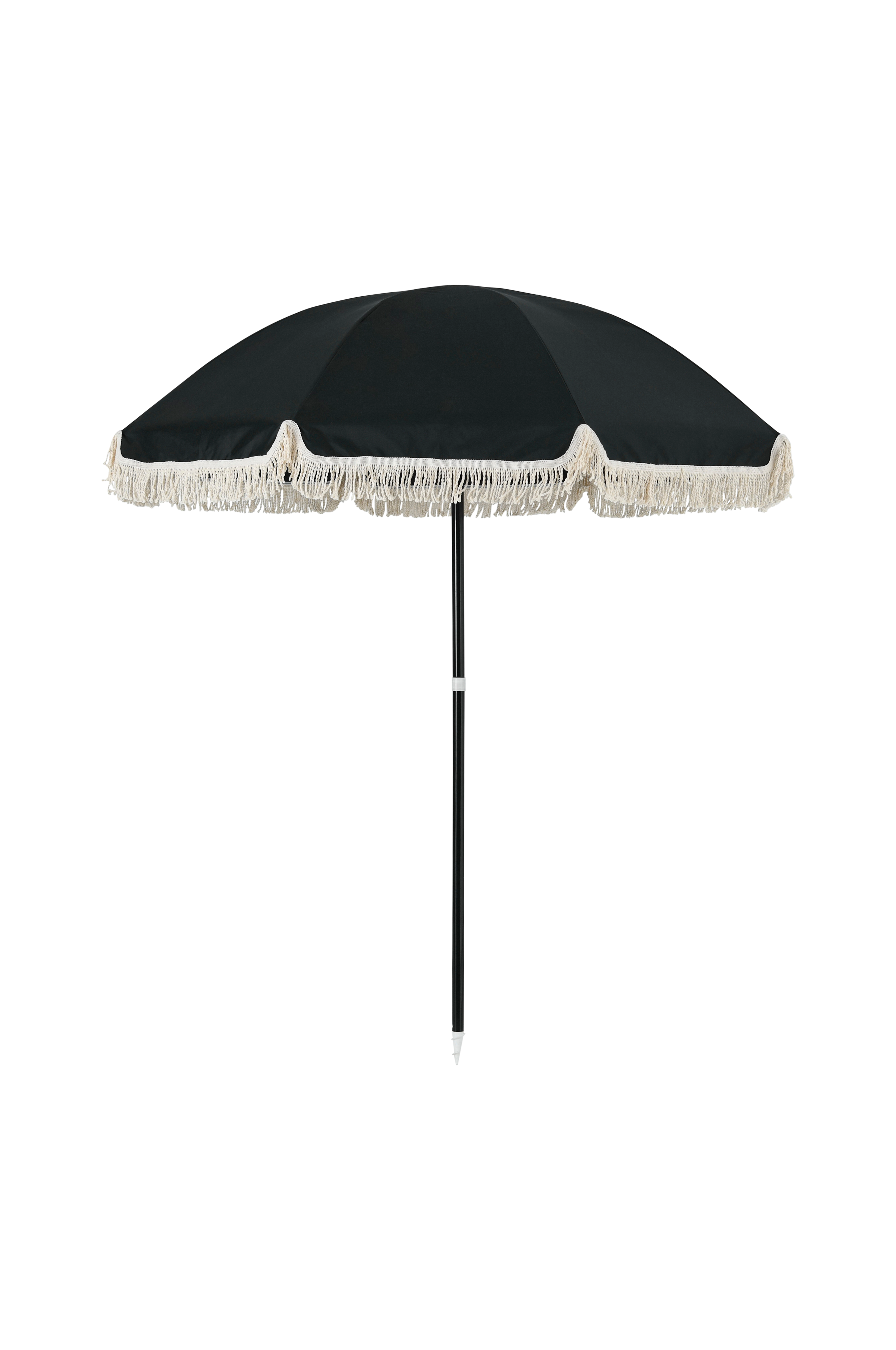 Parasoll med glatt, belagt stoff av 100% polyester med bomullsfrynser. Svart stang i metall som kan vinkles. Skrufot. Utvendig diameter på stangen 3,5 cm. Enklere montering.