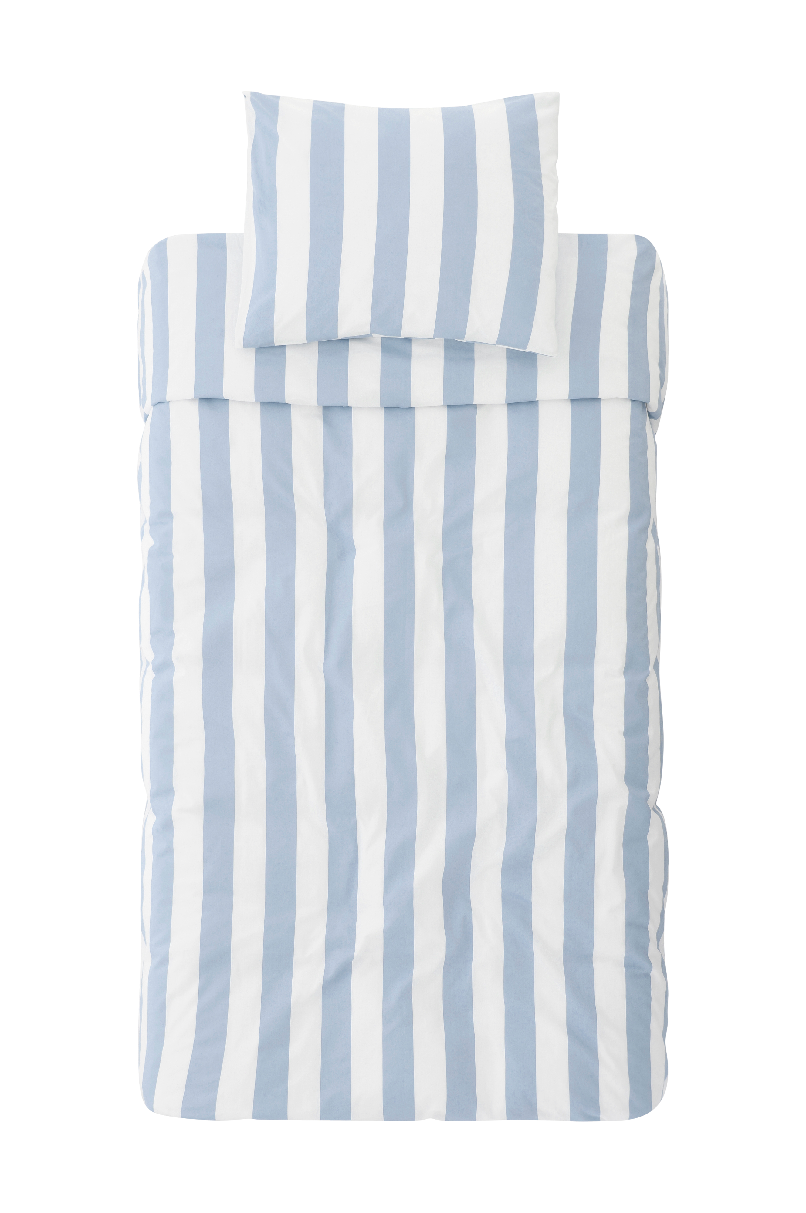 Sengesett i bomull med trykte striper. Trådtetthet 144 tc. Dynetrekk med håndhull. Settet leveres i en stoffpose av samme kvalitet.