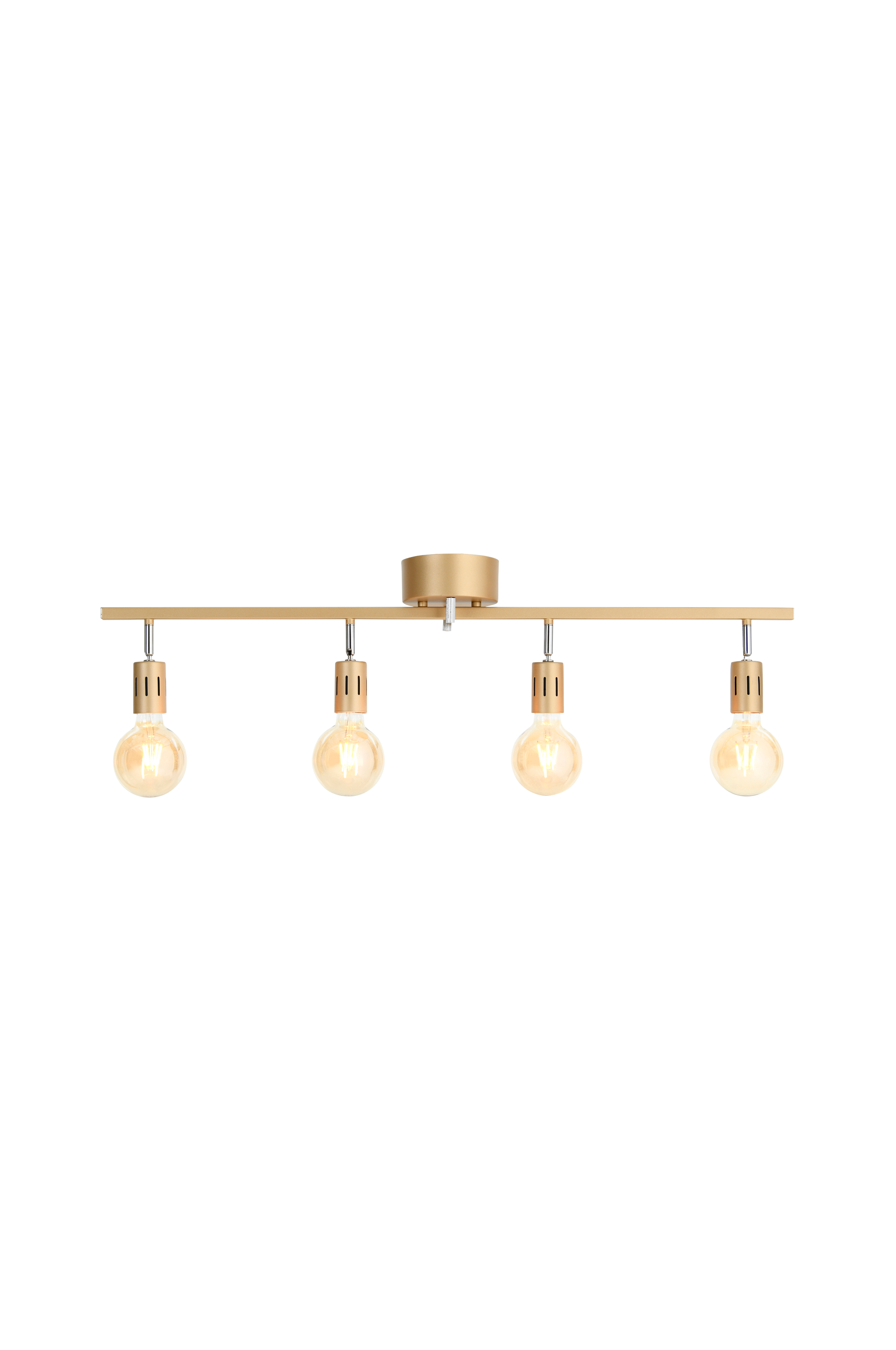 Plafond av metall med 4 regulerbare lampesokler. Kan justeres fritt. Bredde 90 cm, høyde 19,5 cm. Takkoppens diameter 13 cm. Monteres med krokoppheng. 4xE27.
