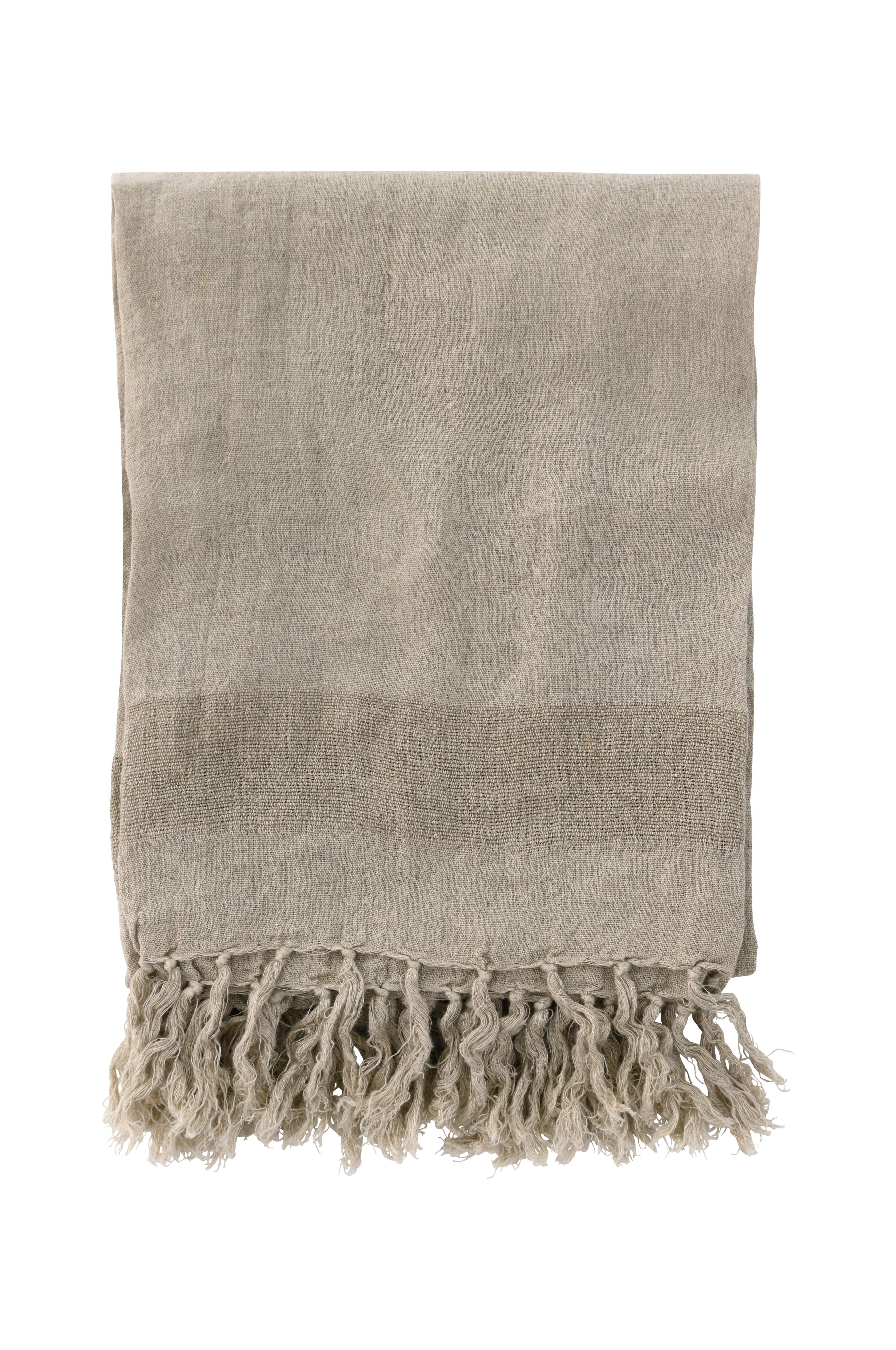 Lett og luftig pledd i mykvasket lin. Vevde striper i overkant og nederkant. Frynser på kortsidene. Str 130x170 cm.