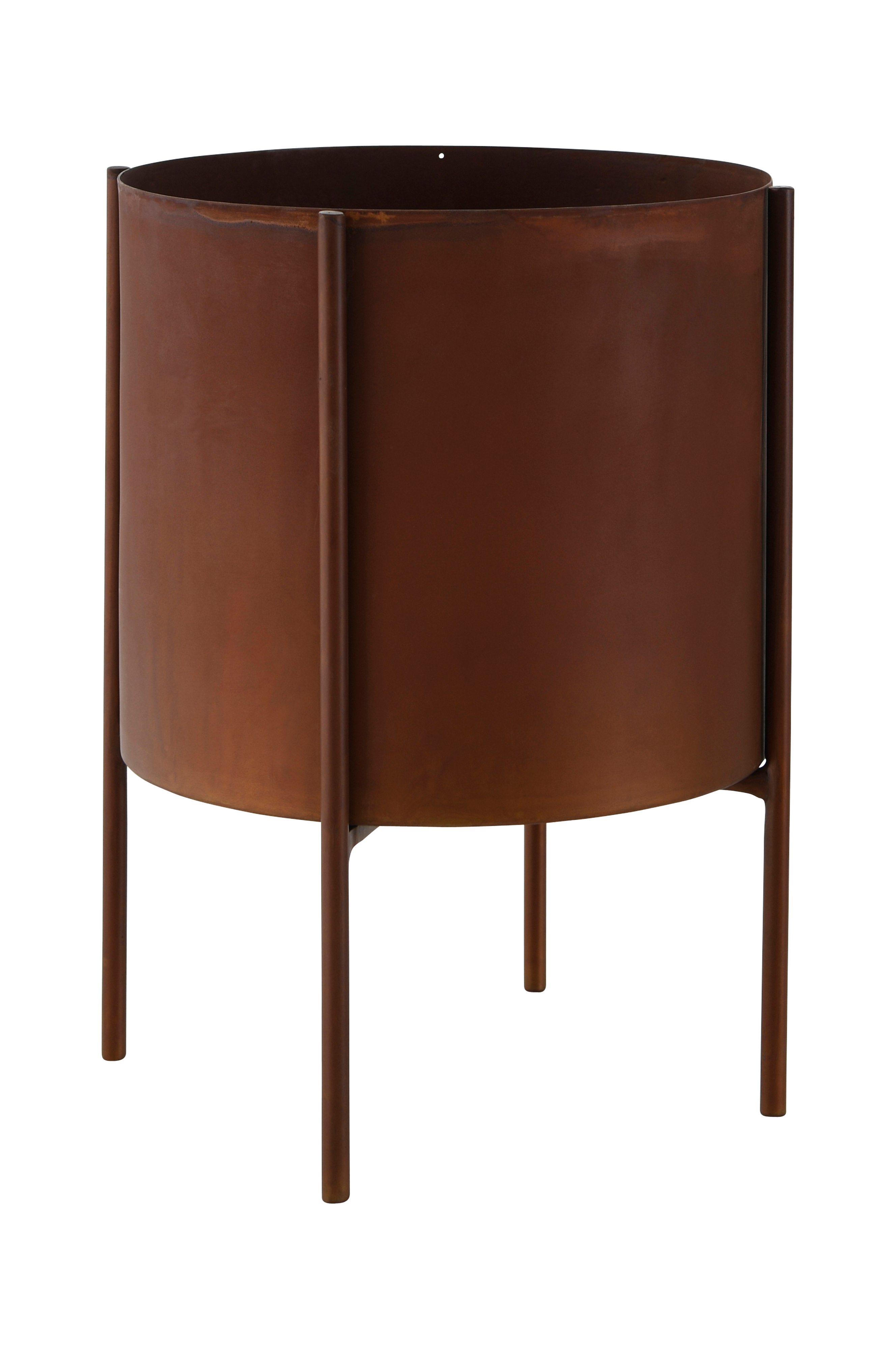 Potte av jern med stativ på 4 ben. Stativet er vendbart, og potten kan plasseres på begge sider av stativet for ulike høyder. Krukkens mål: Høyde 22 cm, Ø 25 cm. Plassert i stativet blir den høyeste høyden 45 cm og den laveste høyden 35 cm.