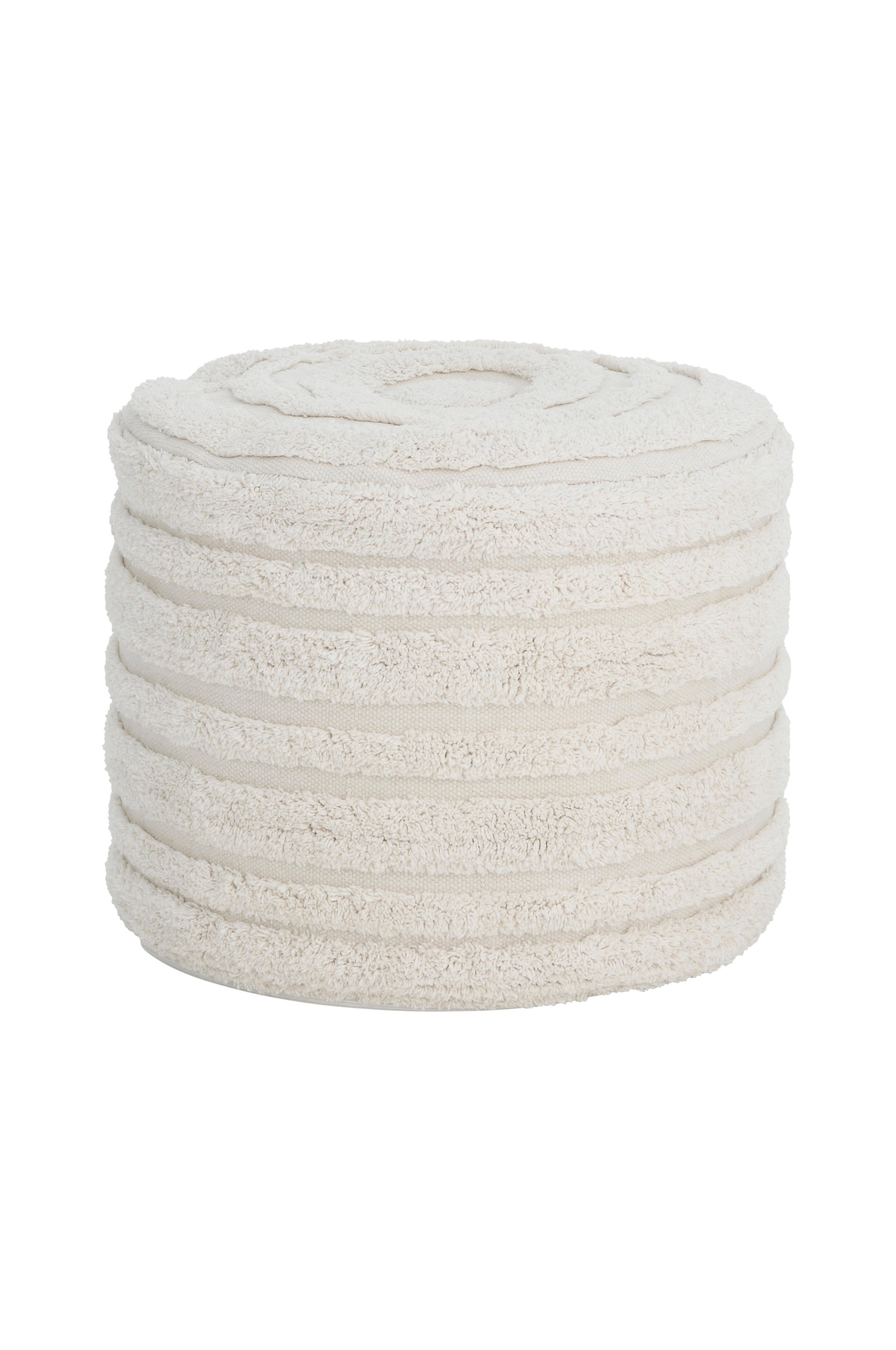 Puff med trekk i 100% bomull med tuftet mønster. Trekket er avtagbart, og kan vaskes for hånd (ikke maskin). Fyll av plastkuler (thermocol).