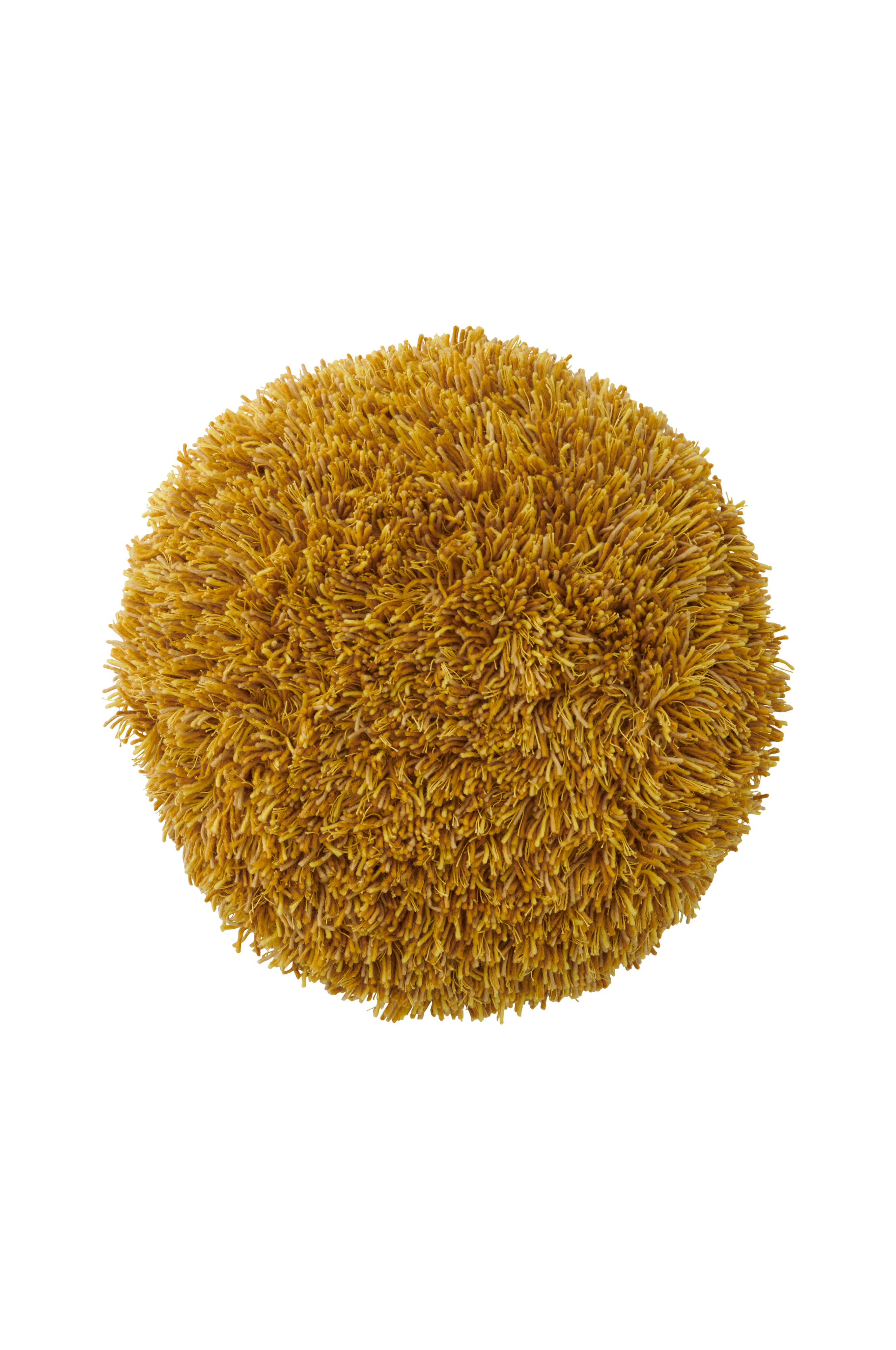 Rund, fylt pute av bomull. Forsiden er tuftet i ull og lin. Glatt bakside. Diameter 65 cm.
