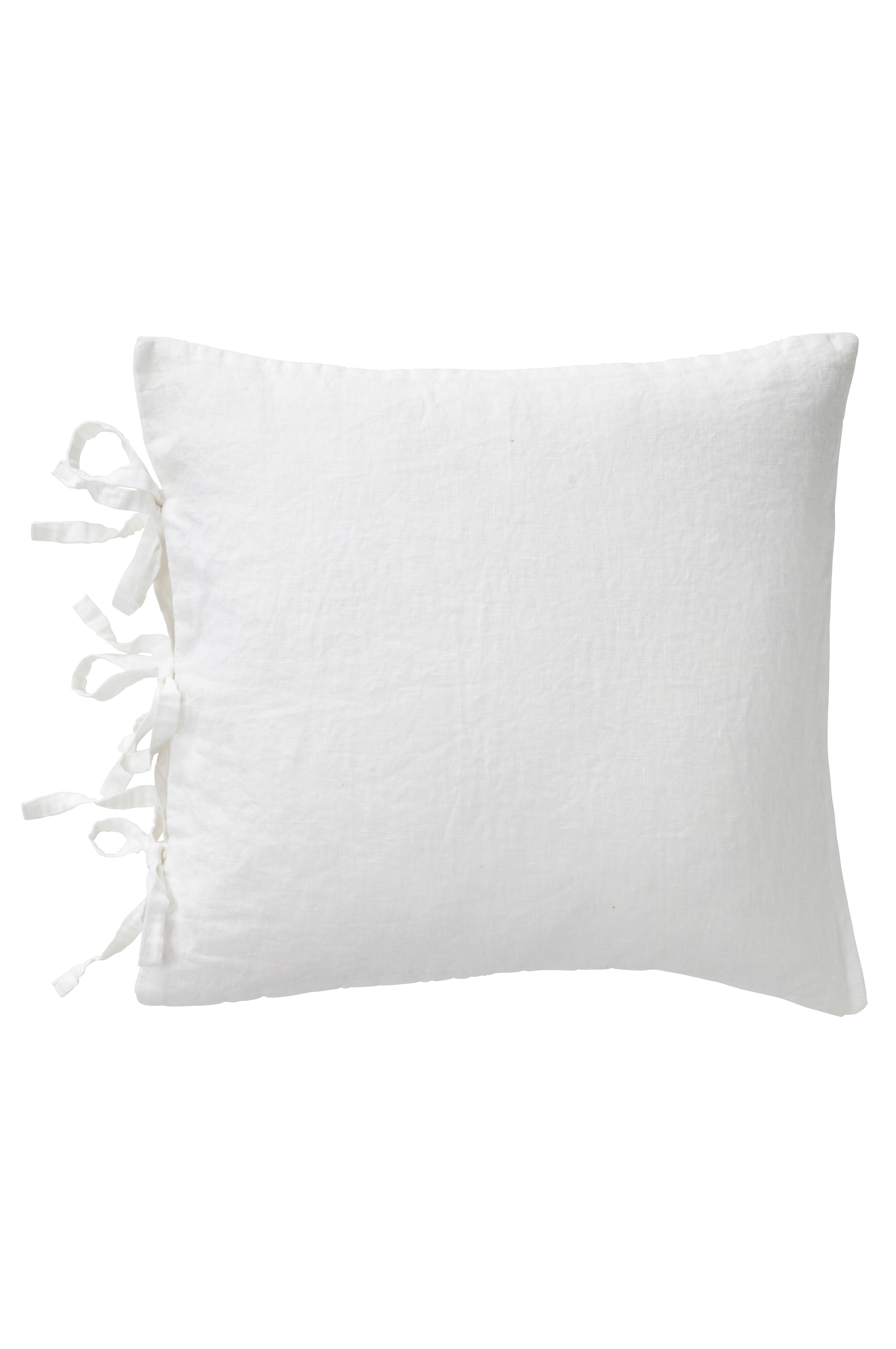 Putetrekk i myk vasket linkvalitet med vintagelook. Av fransk lin. Tre knytebånd i den ene kanten. Str 50 x 50 cm.