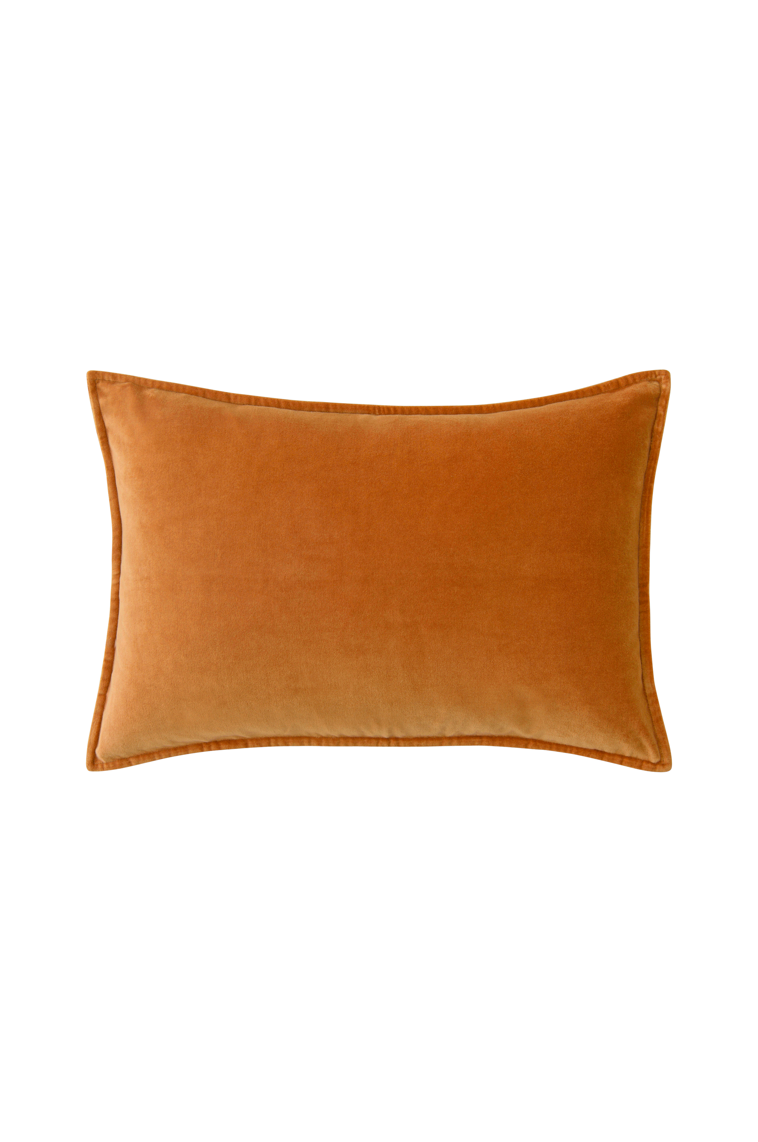 Putetrekk i fløyel av bomull med dekorsøm rundt. Glidelås i bunnen på baksiden. Str. 40x60 cm.