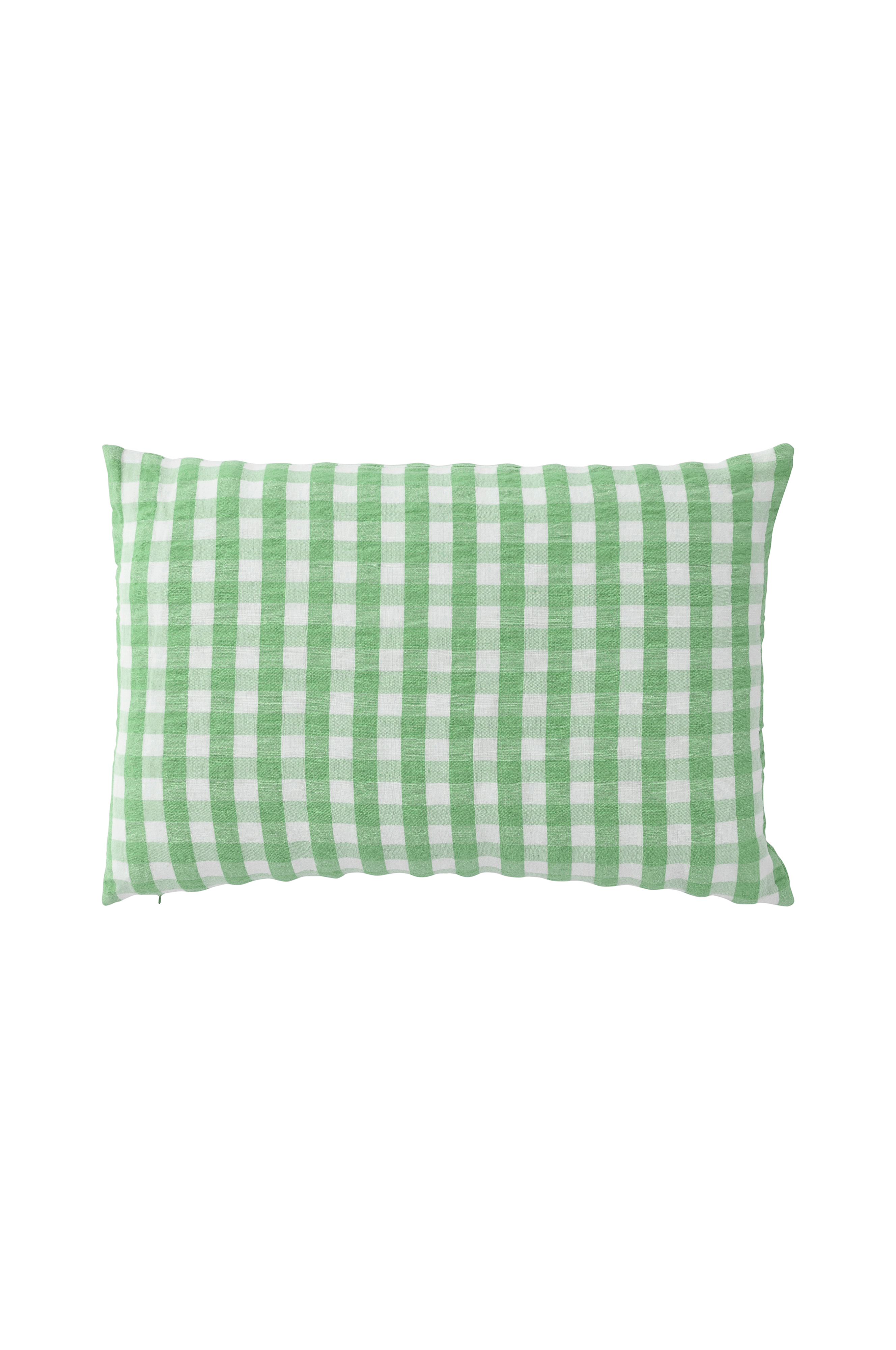 Putetrekk i krepp (seersucker) med lett tekstur i stoffet. Vasket kvalitet i en blanding av bomull og hamp med garnfargede ruter. Skjult glidelås i bunnen.
