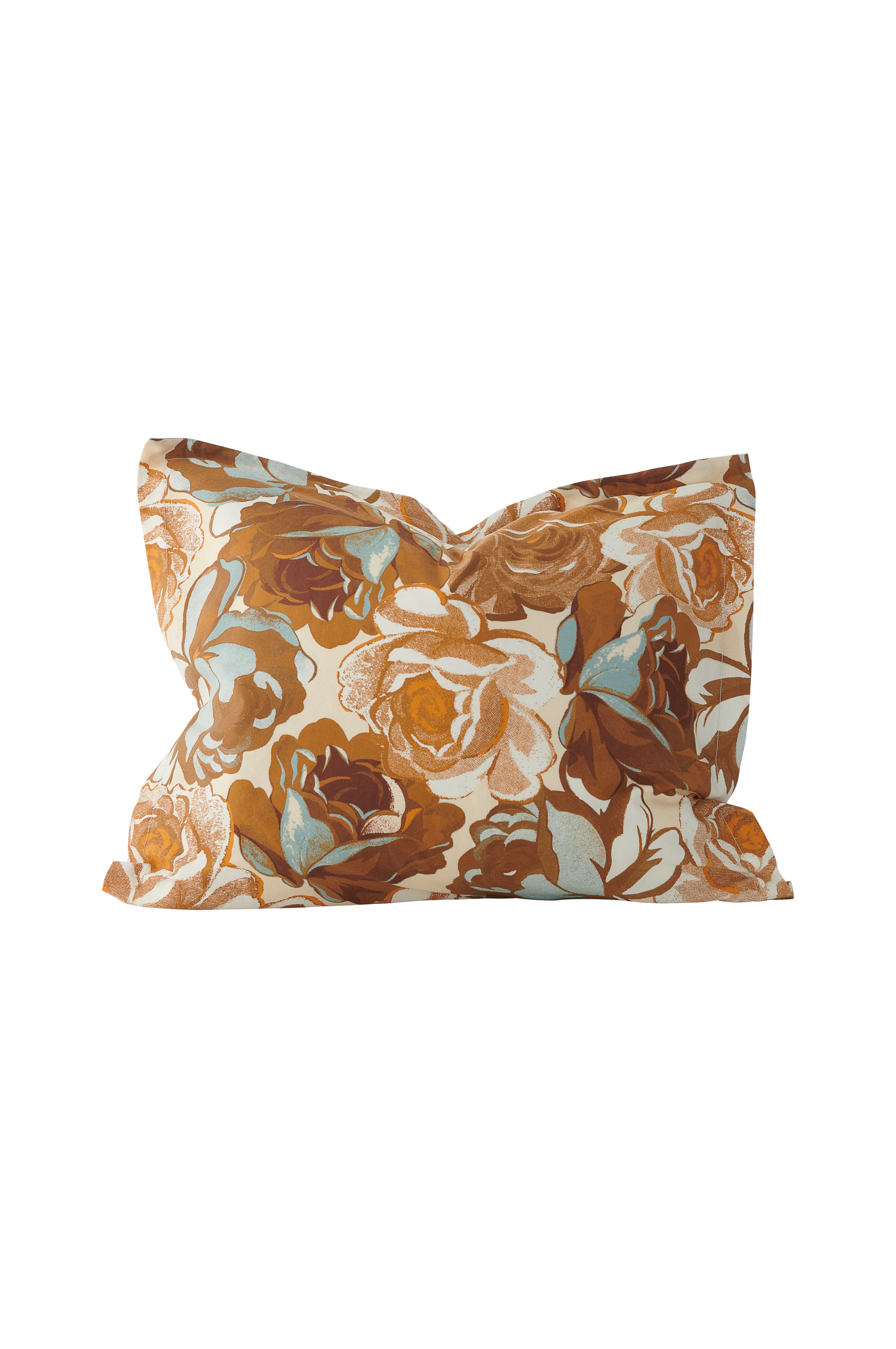 Putevar i vasket sateng av bomull med trykt rosemønster. Trådtetthet 300 tc. Putevaret leveres i en stoffveske med samme kvalitet og mønster. Størrelse 50x60 cm + 3 cm vinge rundt.