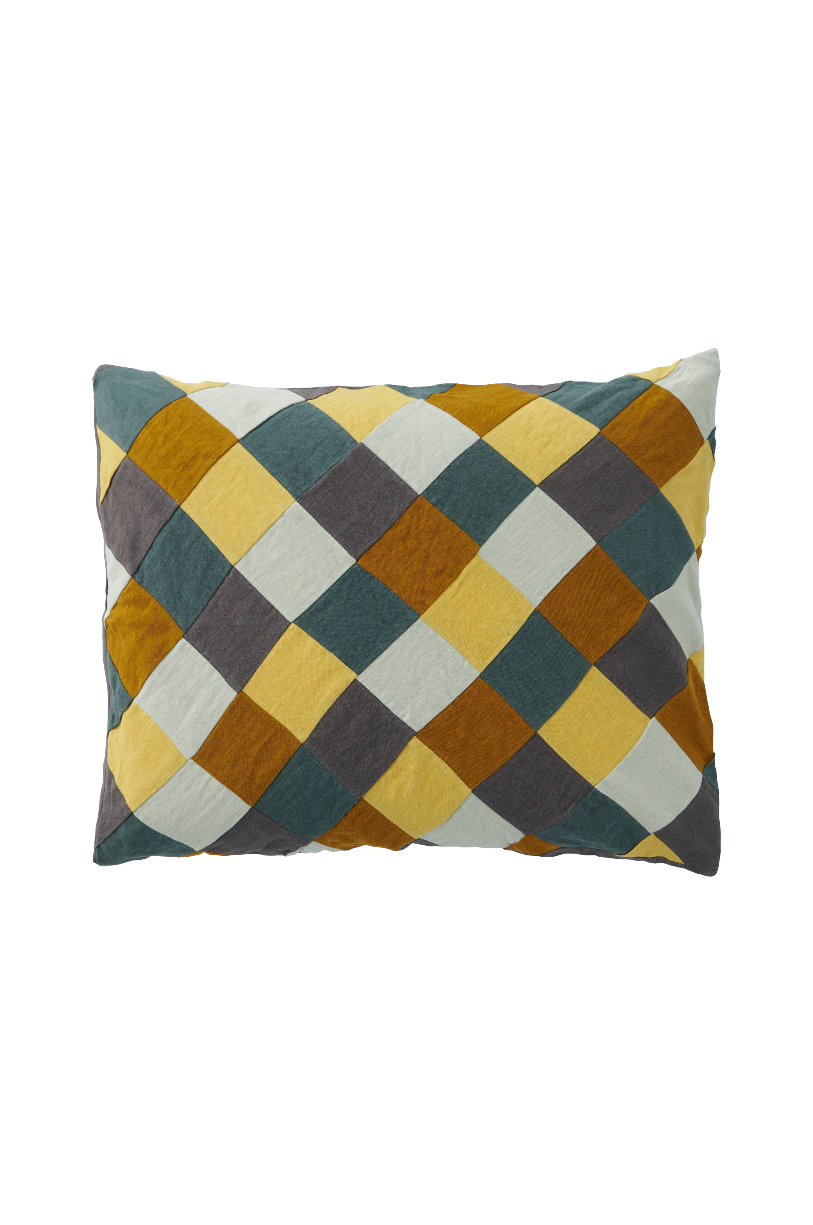 Putevar i vasket lin. Patchwork på forsiden med håndklipte ruter som er sydd for hånd. Ensfarget bakside.