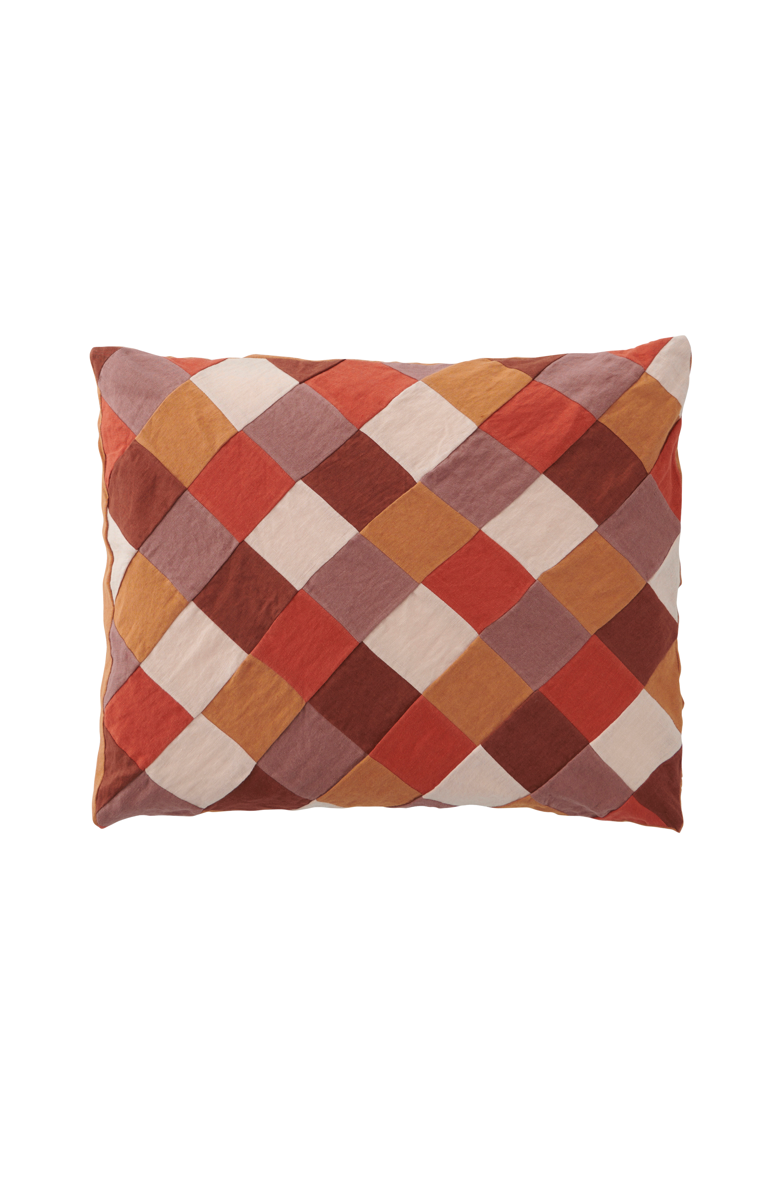 Putevar i vasket lin. Patchwork på forsiden med håndklipte ruter som er sydd for hånd. Ensfarget bakside.