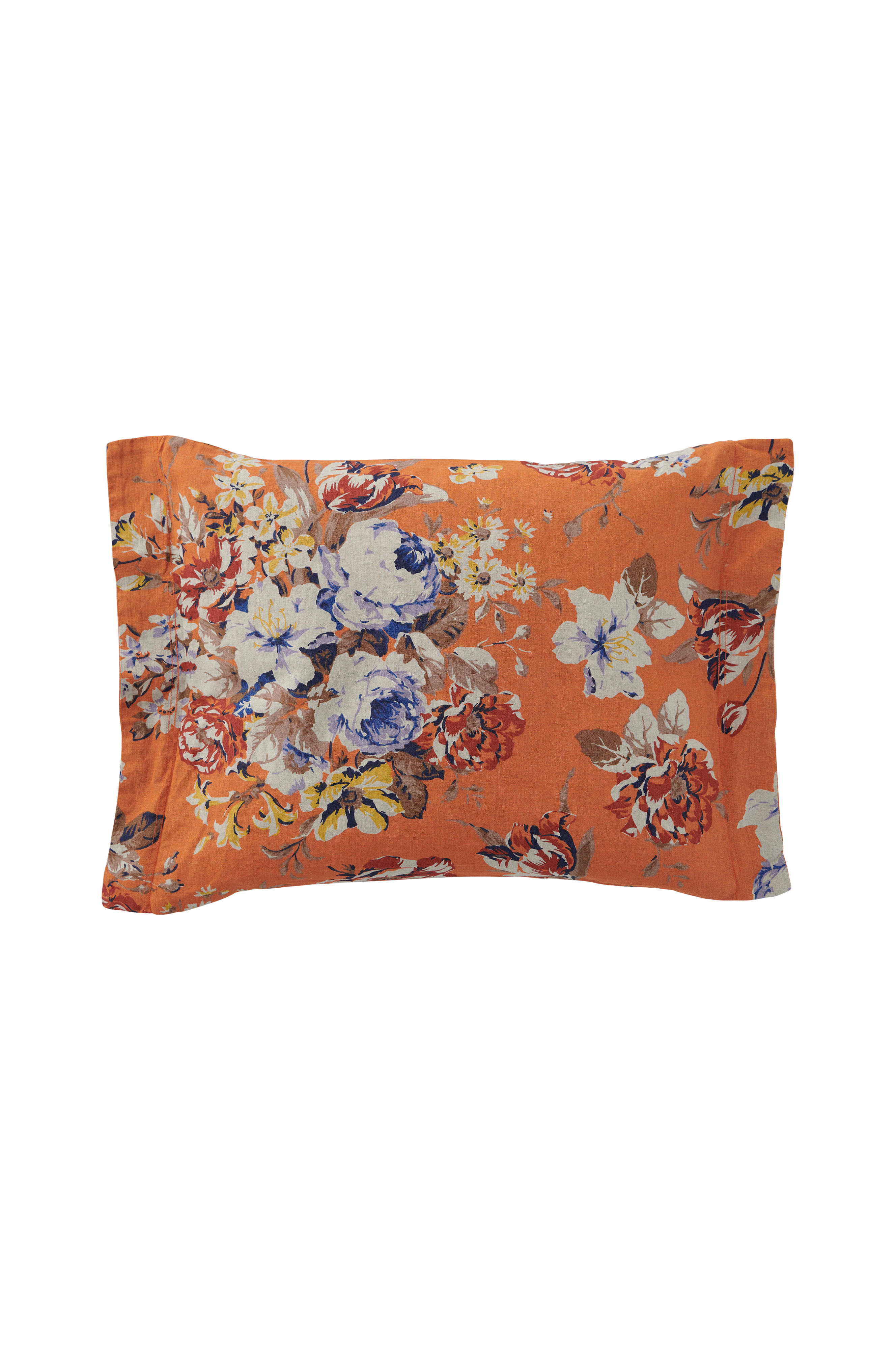 Putevar i vintagevasket linkvalitet av fransk lin med trykt rosemønster på synlig linbunn. Str 50x60 cm + 5 cm vinge på kortsidene.