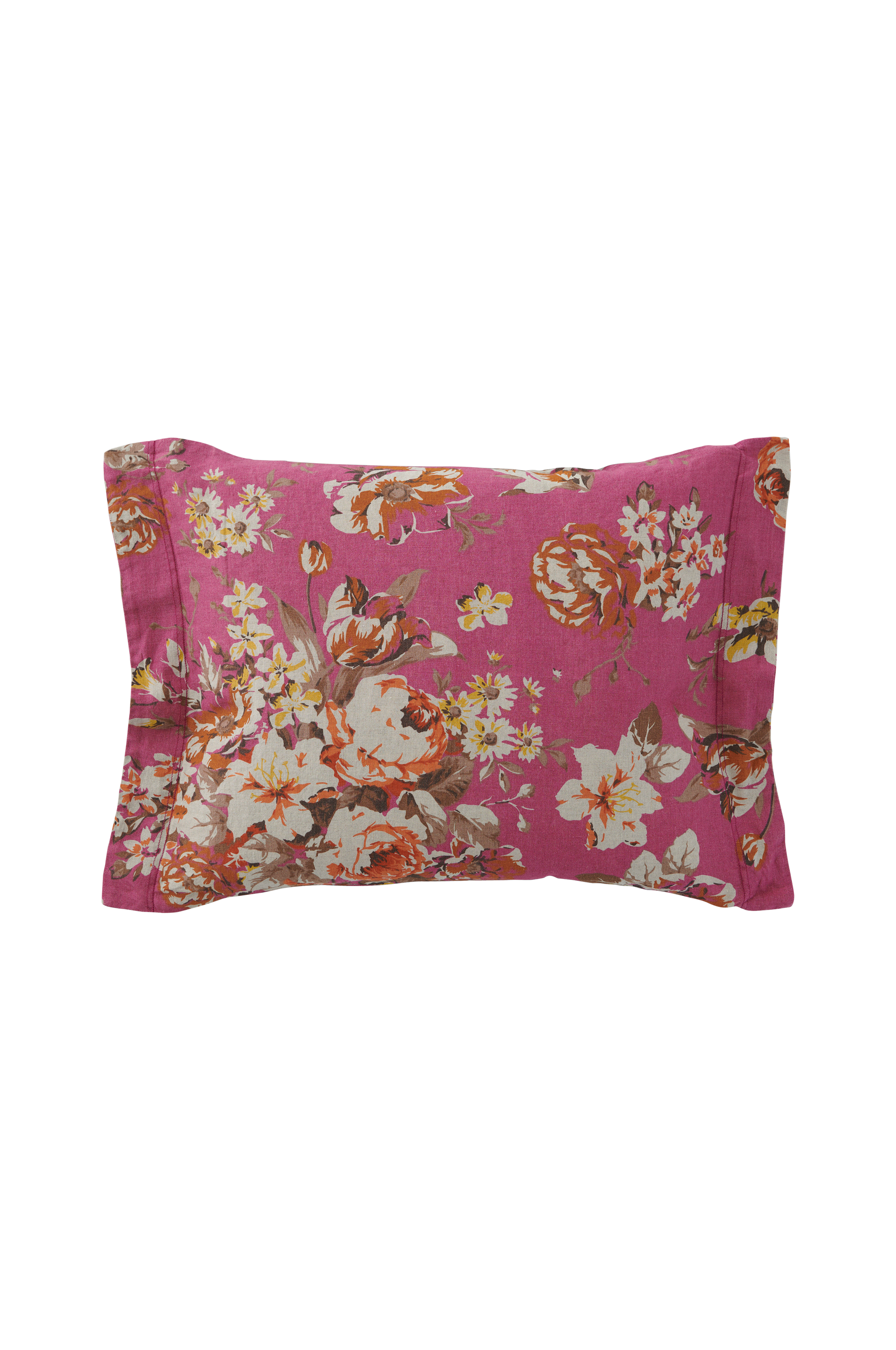 Putevar i vintagevasket linkvalitet av fransk lin med trykt rosemønster på synlig linbunn. Str 50x60 cm + 5 cm vinge på kortsidene.