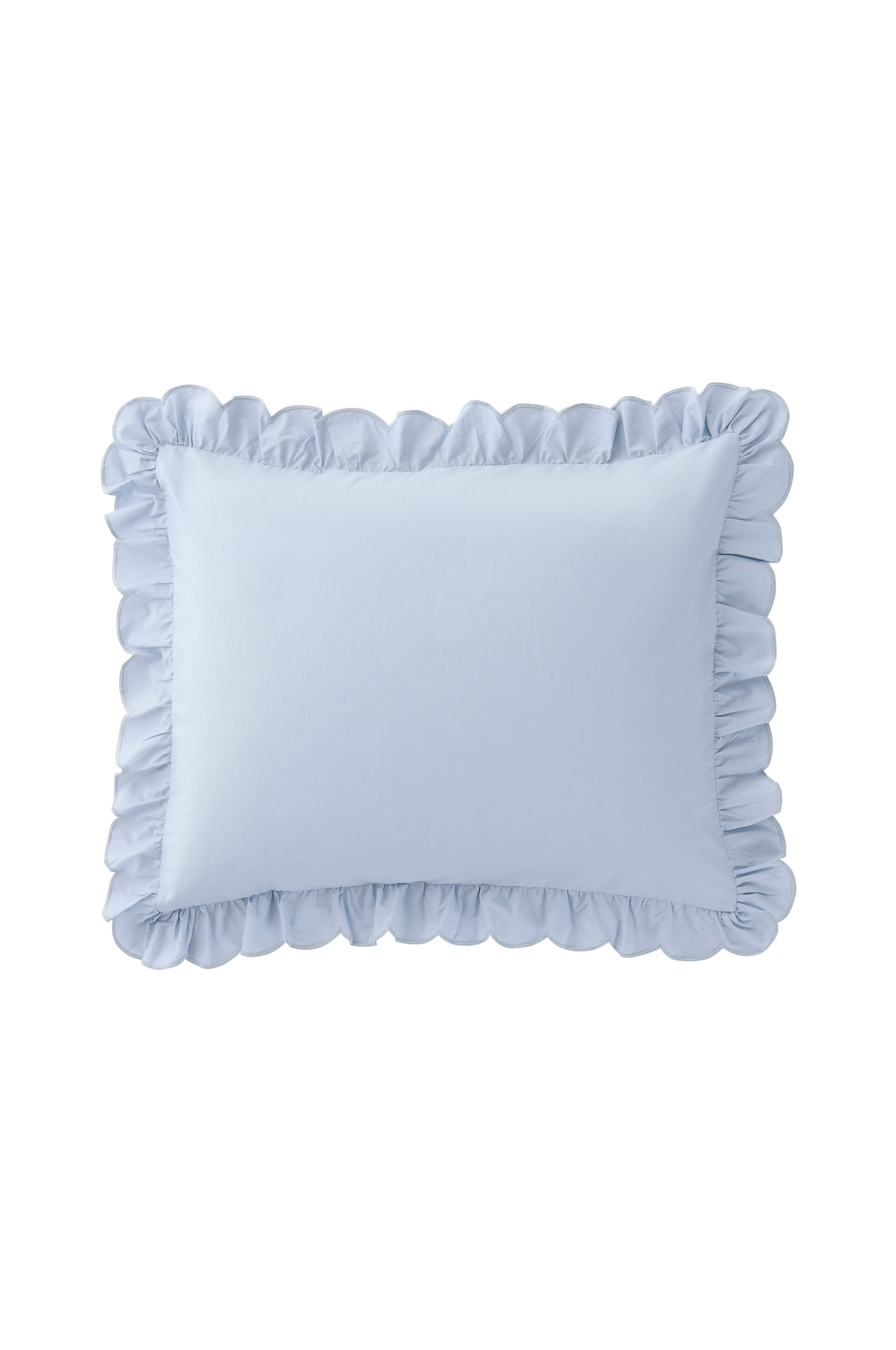 Putevar i vasket bomullspercale. 6 cm buet volangkant rundt med en dekorativ avsluttende søm. Trådtetthet 200 tc. Leveres i en stoffveske av samme kvalitet.