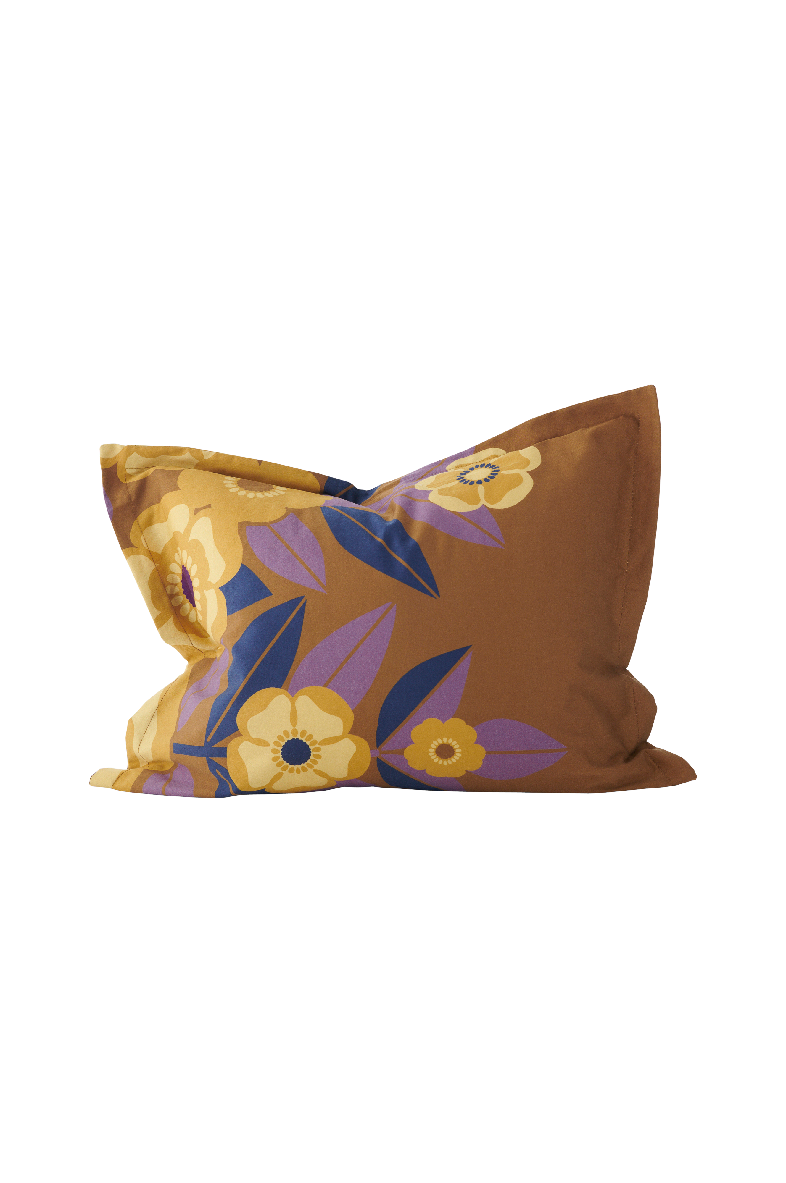 Putevar i vasket sateng av økologisk bomull med trykt blomstermønster. Trådtetthet 300 tc. Putevaret leveres i en stoffveske med samme kvalitet og mønster. Størrelse 50x60 cm + 3 cm vinge rundt.