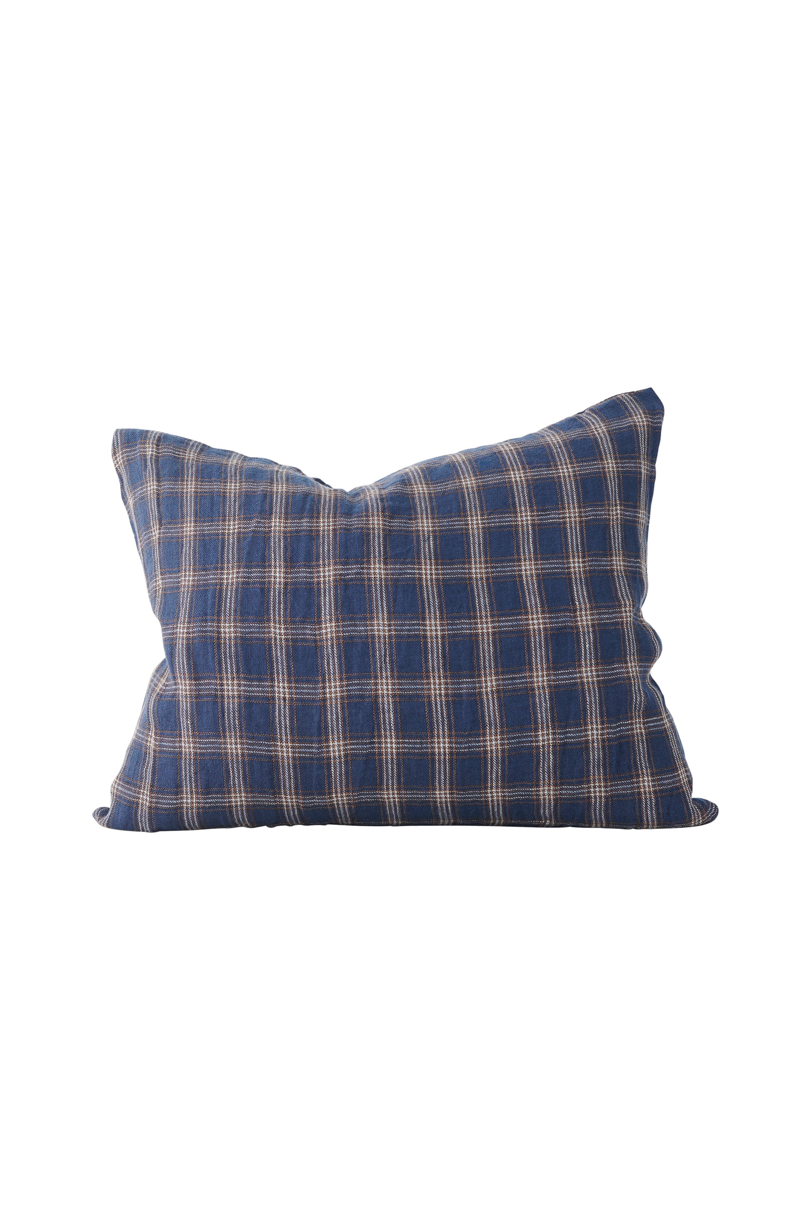 Putevar i vasket linkvalitet, av fransk lin. Garnfargede ruter. Putevaret leveres i en stoffveske med samme kvalitet og mønster. Størrelse 50x60 cm.