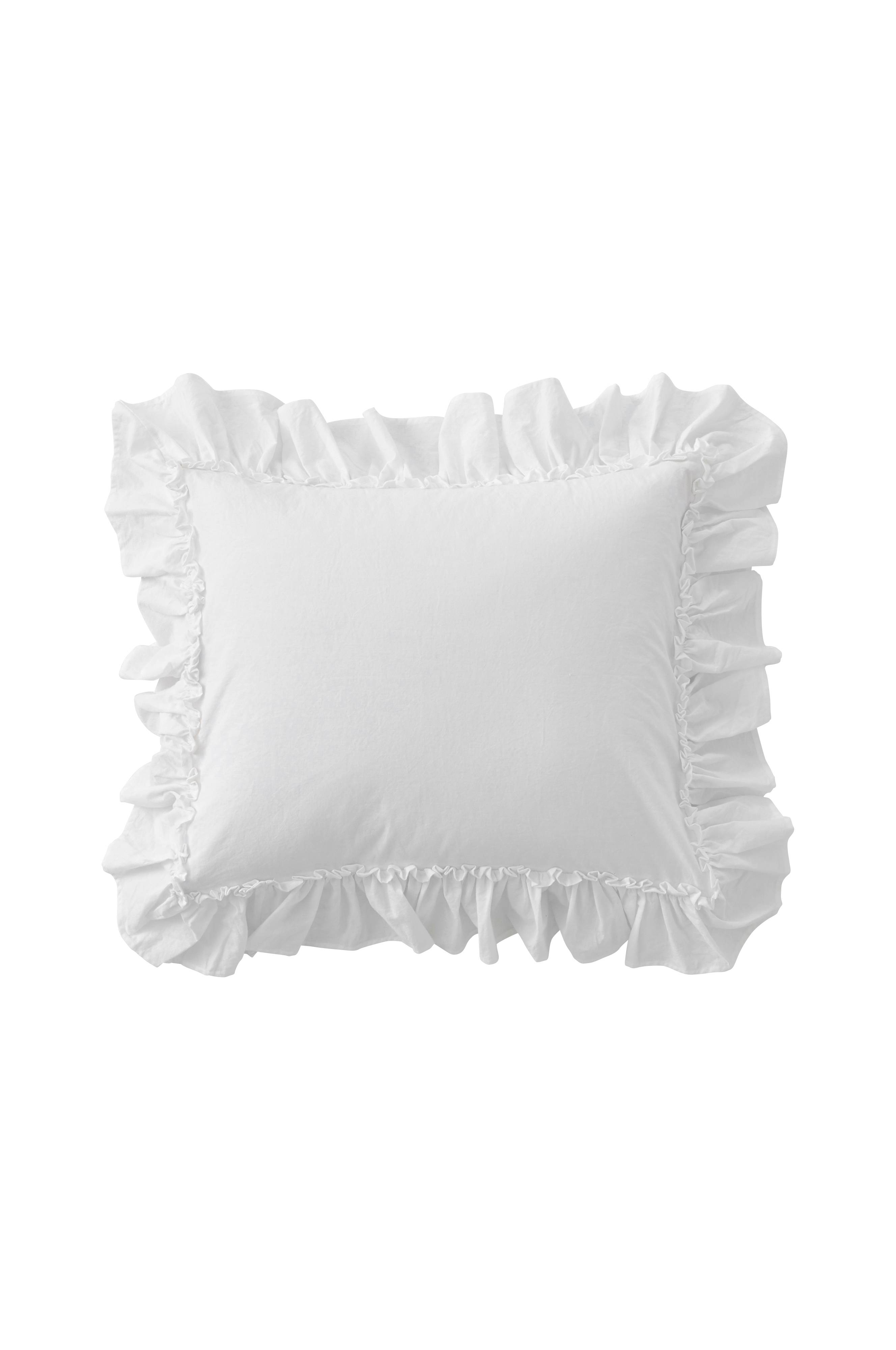 Putevar i herlig kvalitet av mykvasket økologisk bomull. Trådtetthet 144 tc. 13 cm rynket volang rundt. Str. putevar 50x60 cm.