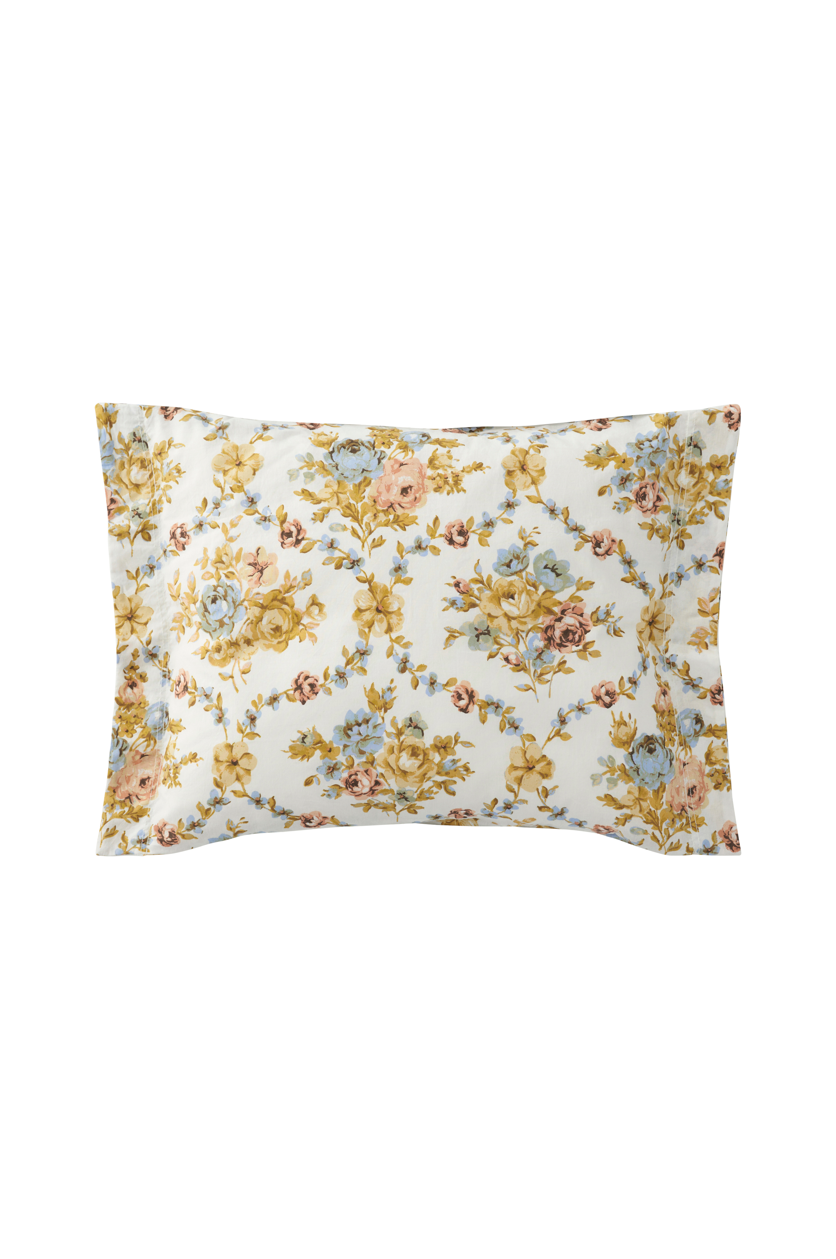 Putevar av mykvasket bomull med trykt rosemønster. Trådtetthet 144 tc. Putevaret leveres i en stoffpose av samme kvalitet. Str 50x60 cm + 5 cm vinge på kortsidene.