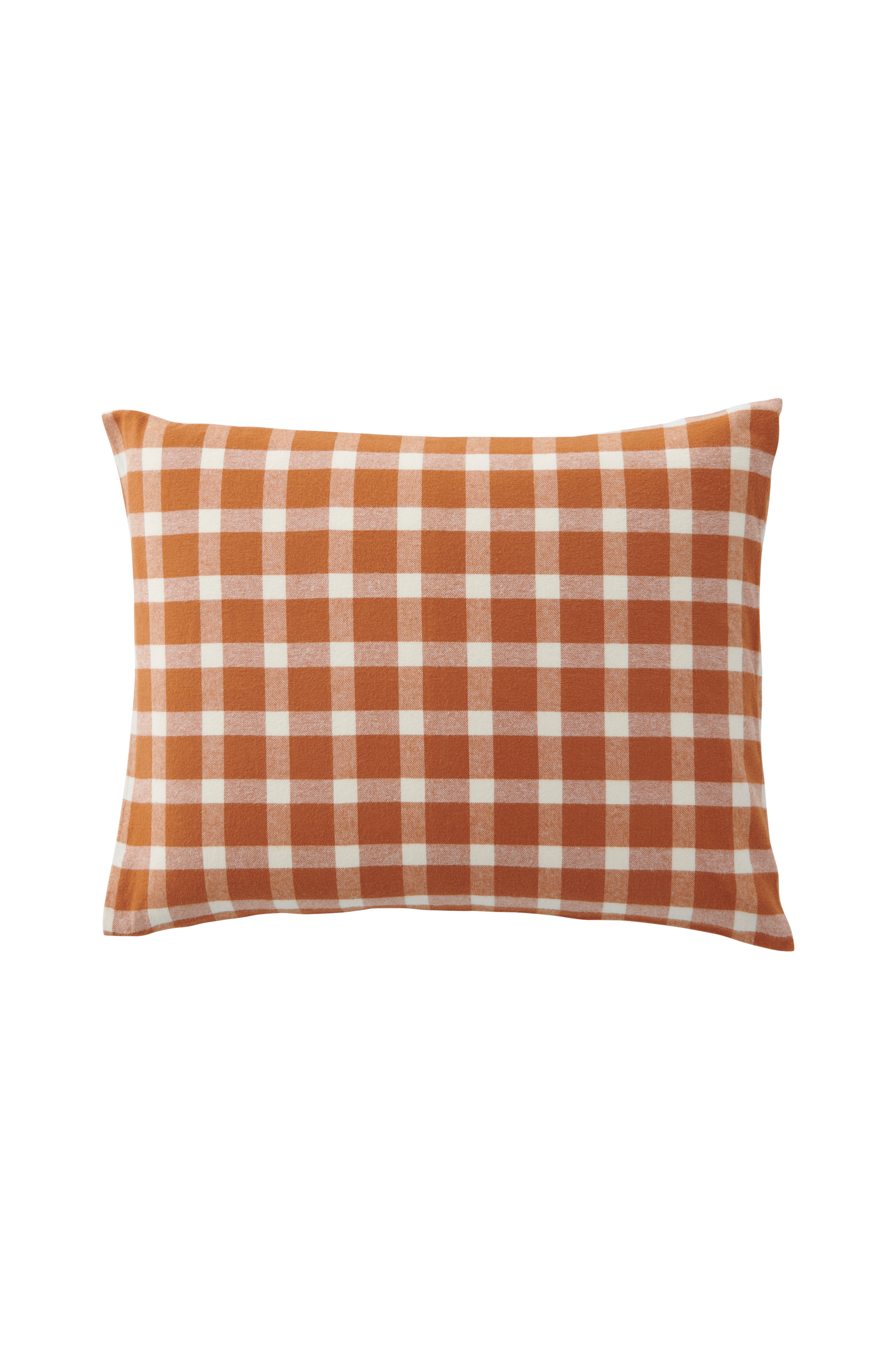 Putevar i flanell av økologisk bomull med garnfargede ruter. Vasket kvalitet med myk, børstet overflate og doble jeanssømmer. Trådtetthet 110 TC. Str 50x60 cm.