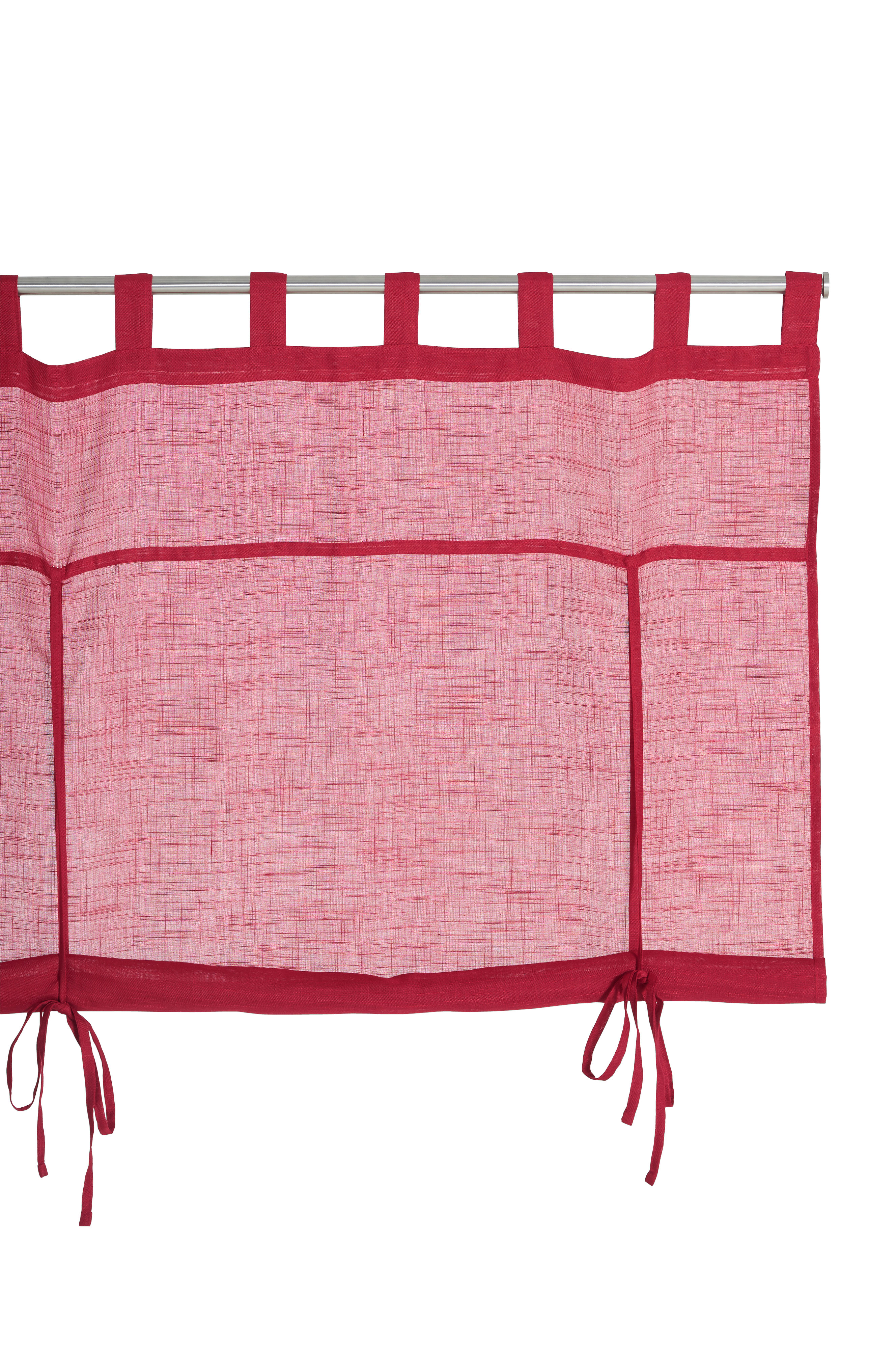 Roll up-gardin av tynn polyester med struktur i linlook. Gardinen rulles opp og festes med knytebånd. Med hemper som træs på gardinstang. Bruk gjerne en rundstav nederst (ikke inkludert).