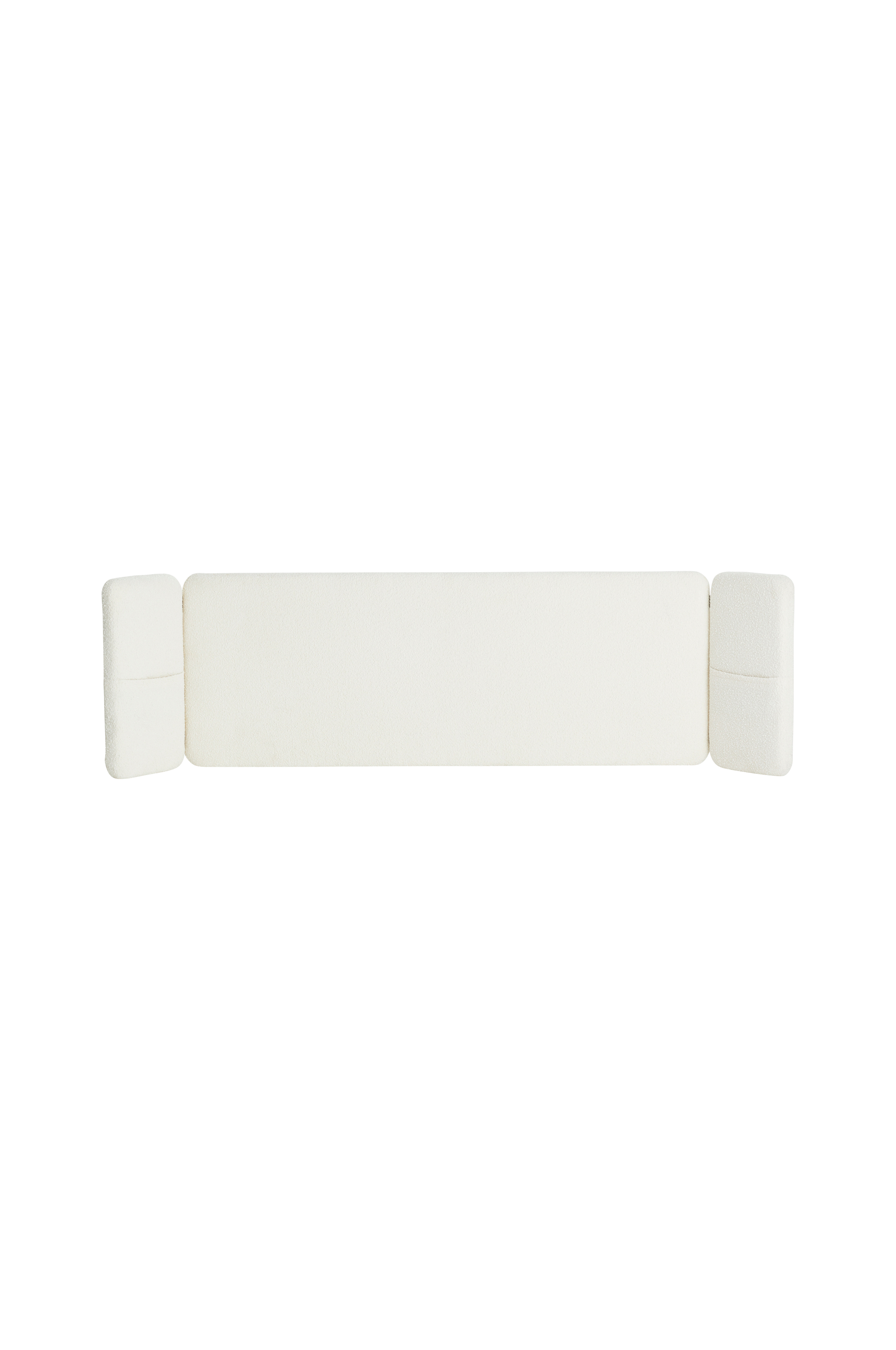 Sengegavl for veggoppheng med trekk i boucléstoff. Brettbare og regulerbare vinger på hver side med en oppbevaringslomme på hver vinge. Stamme i kryssfiner og massiv furu. Skumfyll.