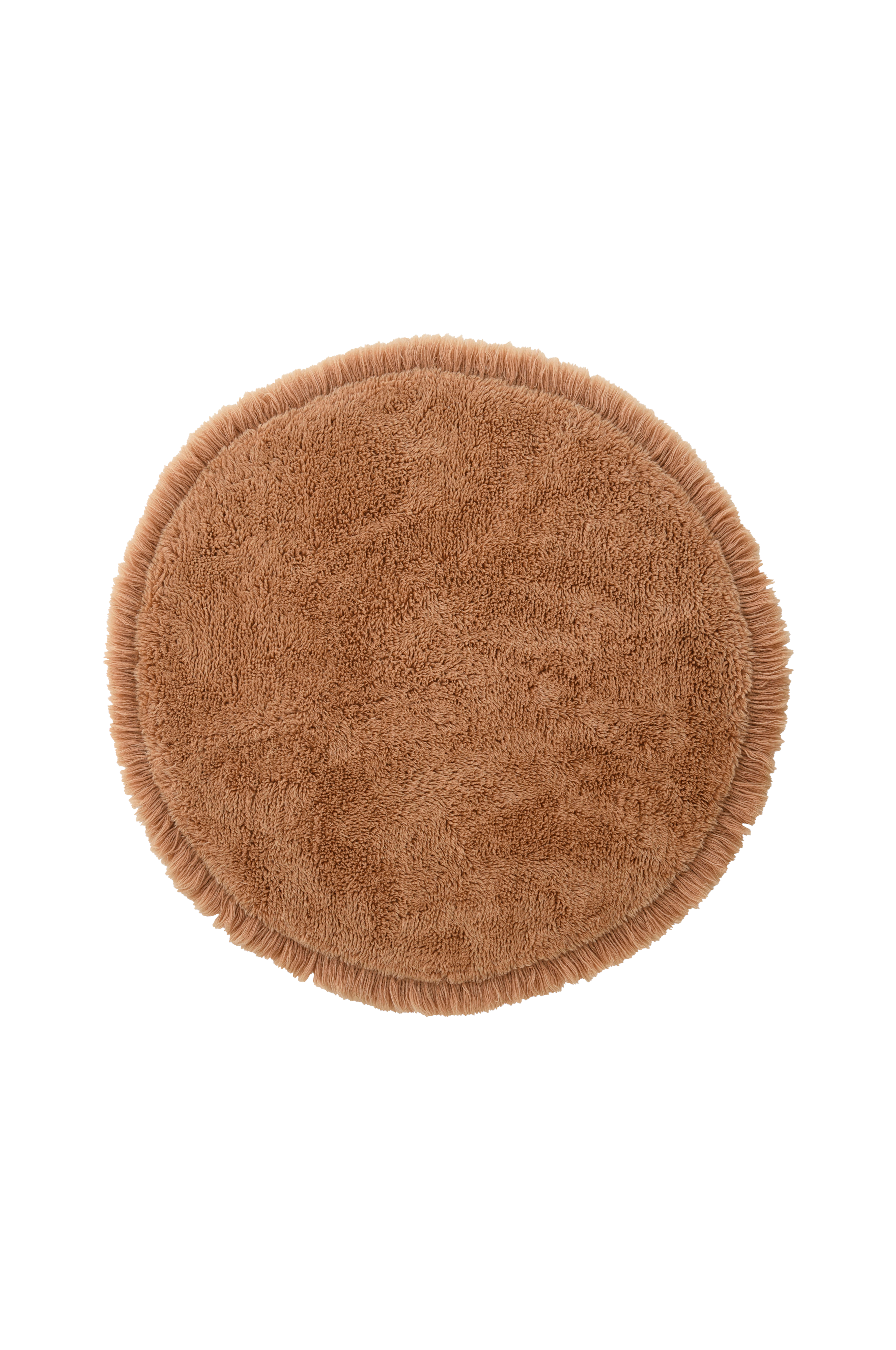 Rundt ryeteppe i ull av høy kvalitet med tykk, tett lugg. Frynser rundt, frynselengde ca. 9 cm. Teppets tykkelse ca. 2 cm.