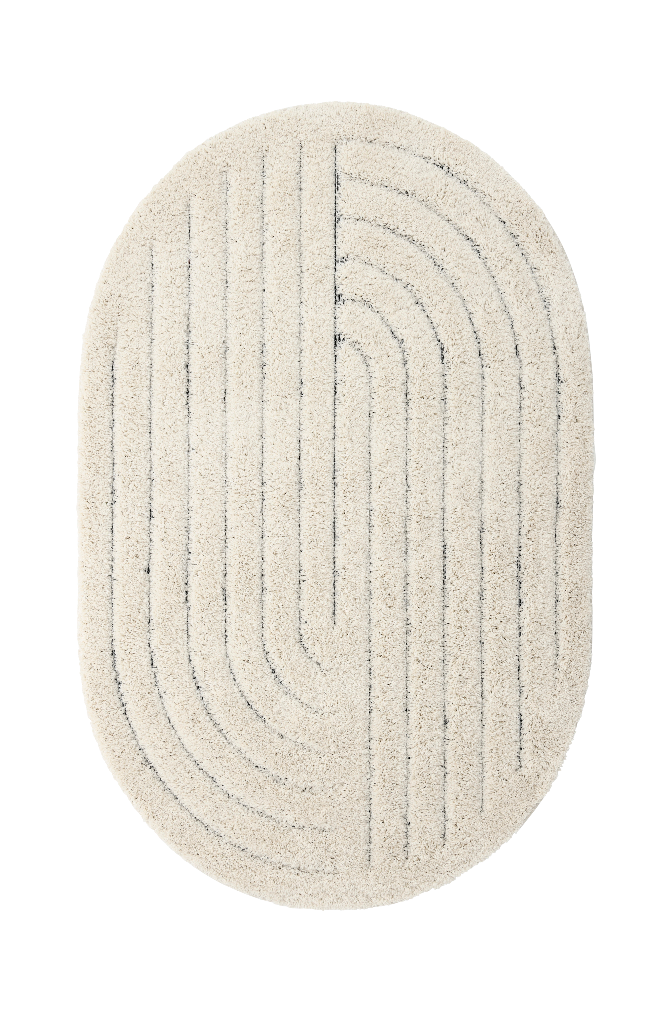 Tuftet ryeteppe med tett, tykk og myk lugg. Skåret relieffmønster. Lugghøyde ca. 2,5 cm.