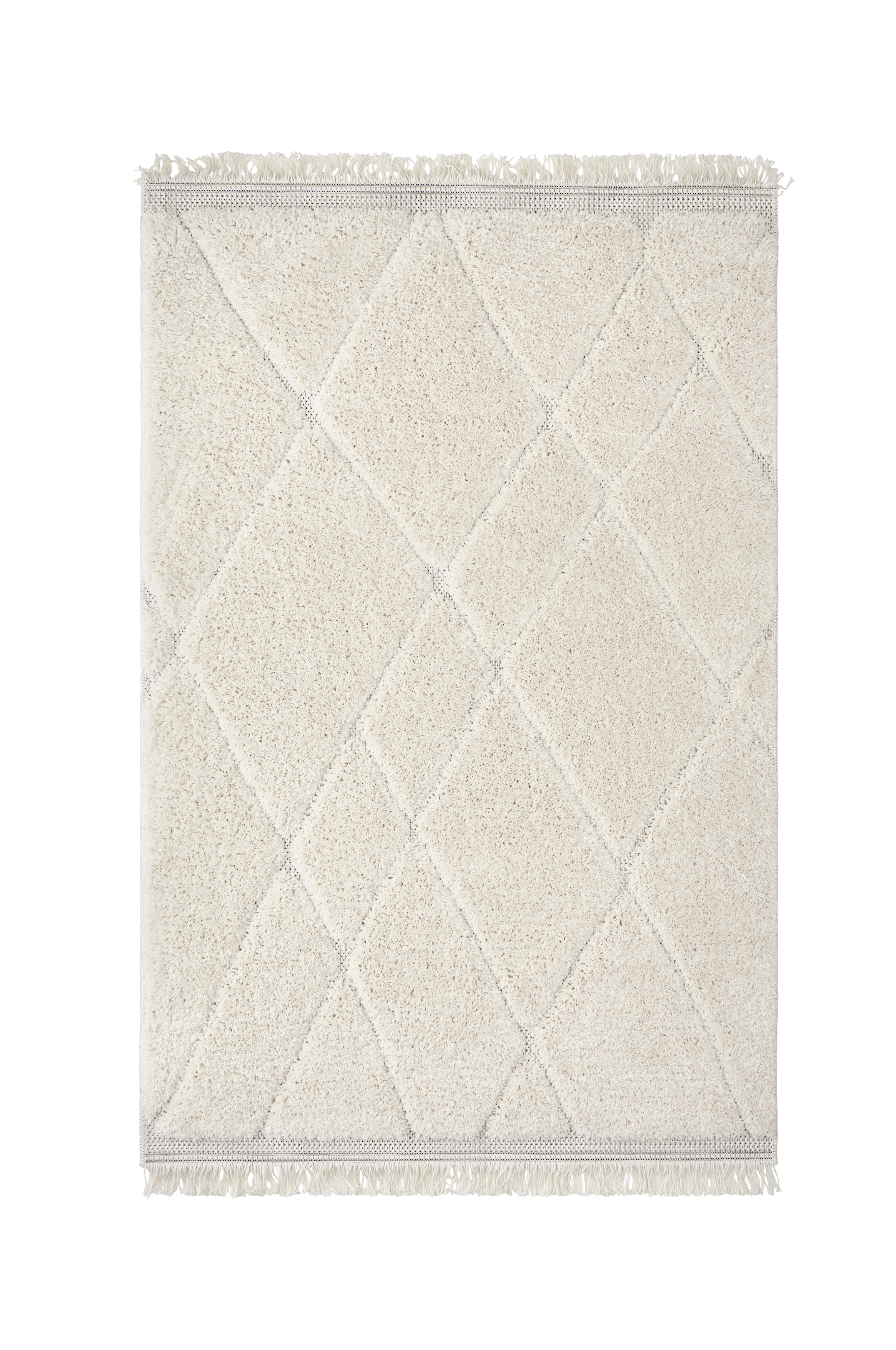 Tuftet ryeteppe med tett, tykk og myk lugg. Strukturmønster med inspirasjon fra tradisjonelle marokkanske tepper. Frynser på kortsidene.
