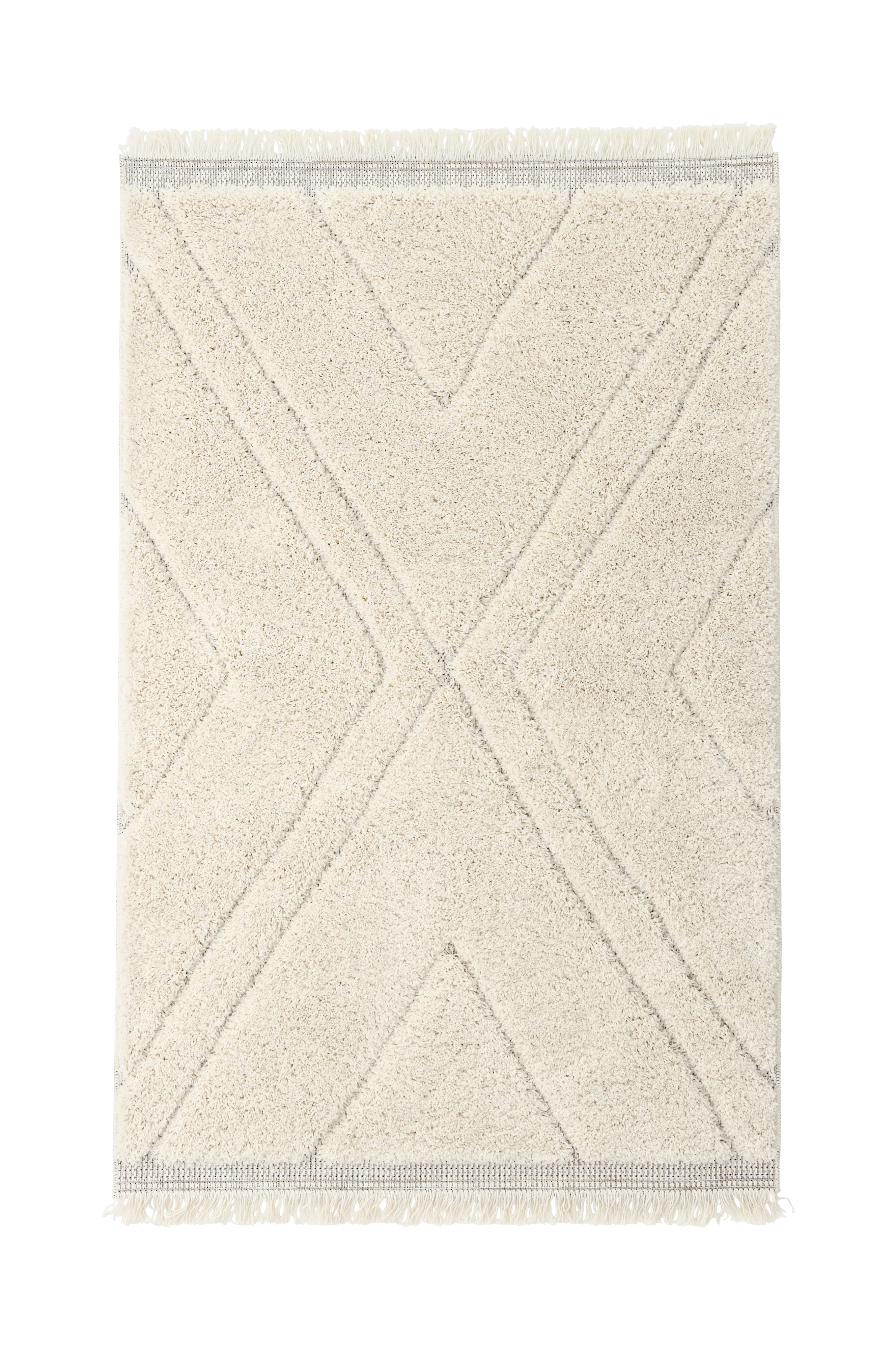 Tuftet ryeteppe med tett, tykk og myk lugg. Skåret mønster. Lugghøyde ca. 2,5 cm. Frynser på kortsidene, frynsenes lengde er 9 cm.