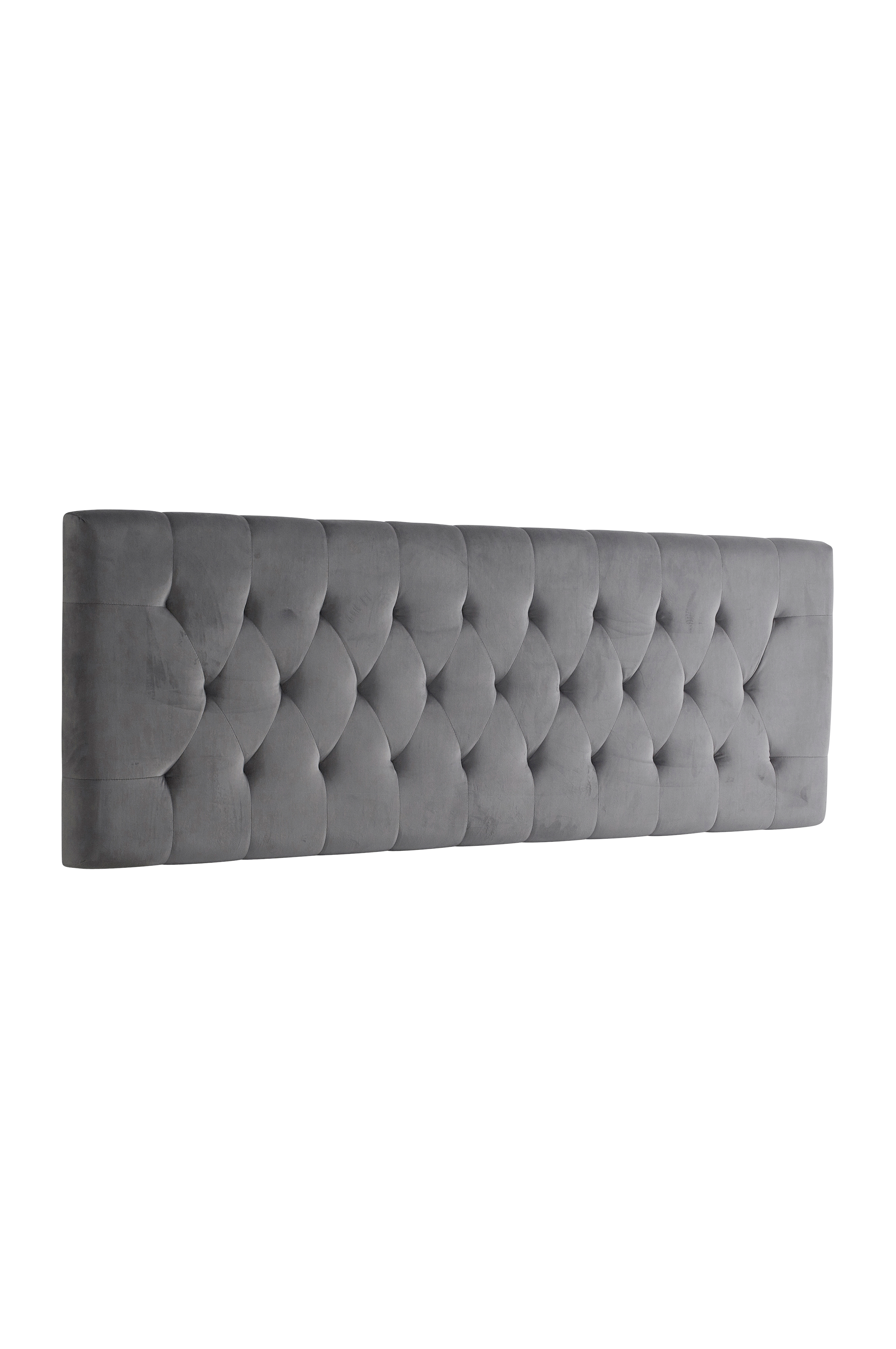 Stoppet sengegavl som festes på veggen (veggfester inngår). Stamme av tre. Trekk i fløyel av polyester og fyll av polyeter. Bredde 185 cm. Høyde 60 cm. Dybde 8 cm.