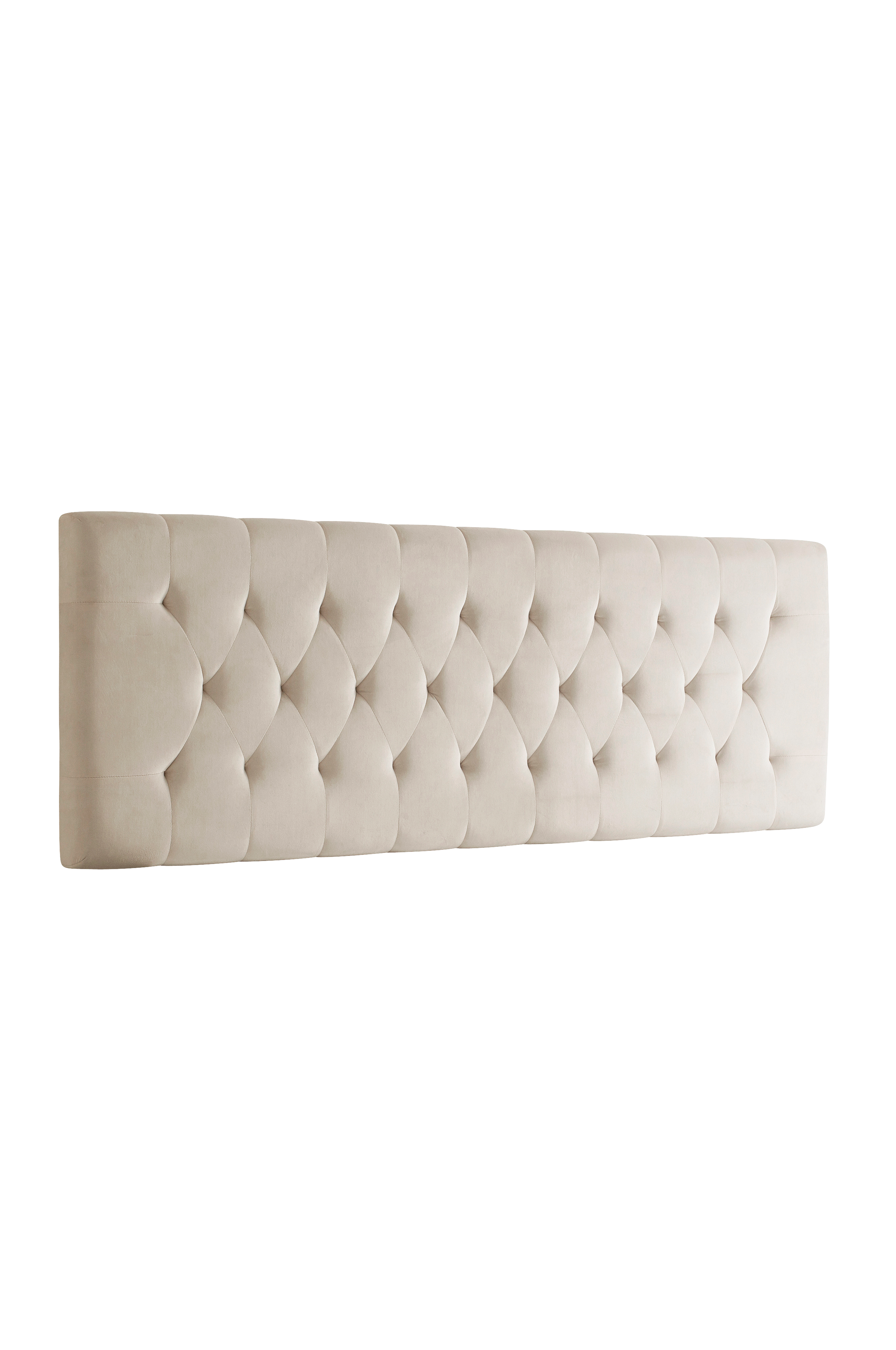 Stoppet sengegavl som festes på veggen (veggfester inngår). Stamme av tre. Trekk i fløyel av polyester og fyll av polyeter. Bredde 185 cm. Høyde 60 cm. Dybde 8 cm.
