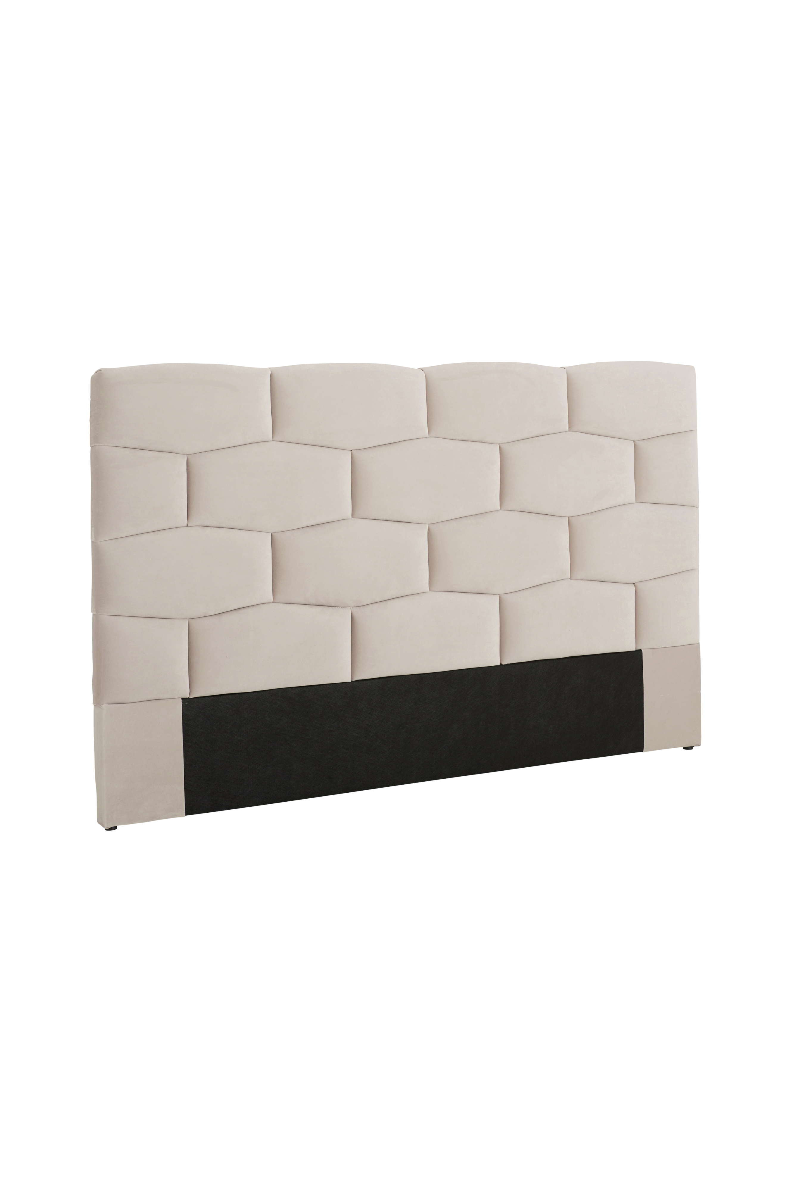 Vattert sengegavl med moderne, klosslignende mønster. Trekk i fløyel av polyester. Stamme i kryssfiner og massivt tre, fyll av polyuretanskum og polyestervatt. Sengegavlen kan stilles på gulvet eller henges på vegg. To veggfester medfølger. Bredde 183 cm, høyde 115 cm, dybde 13 cm.