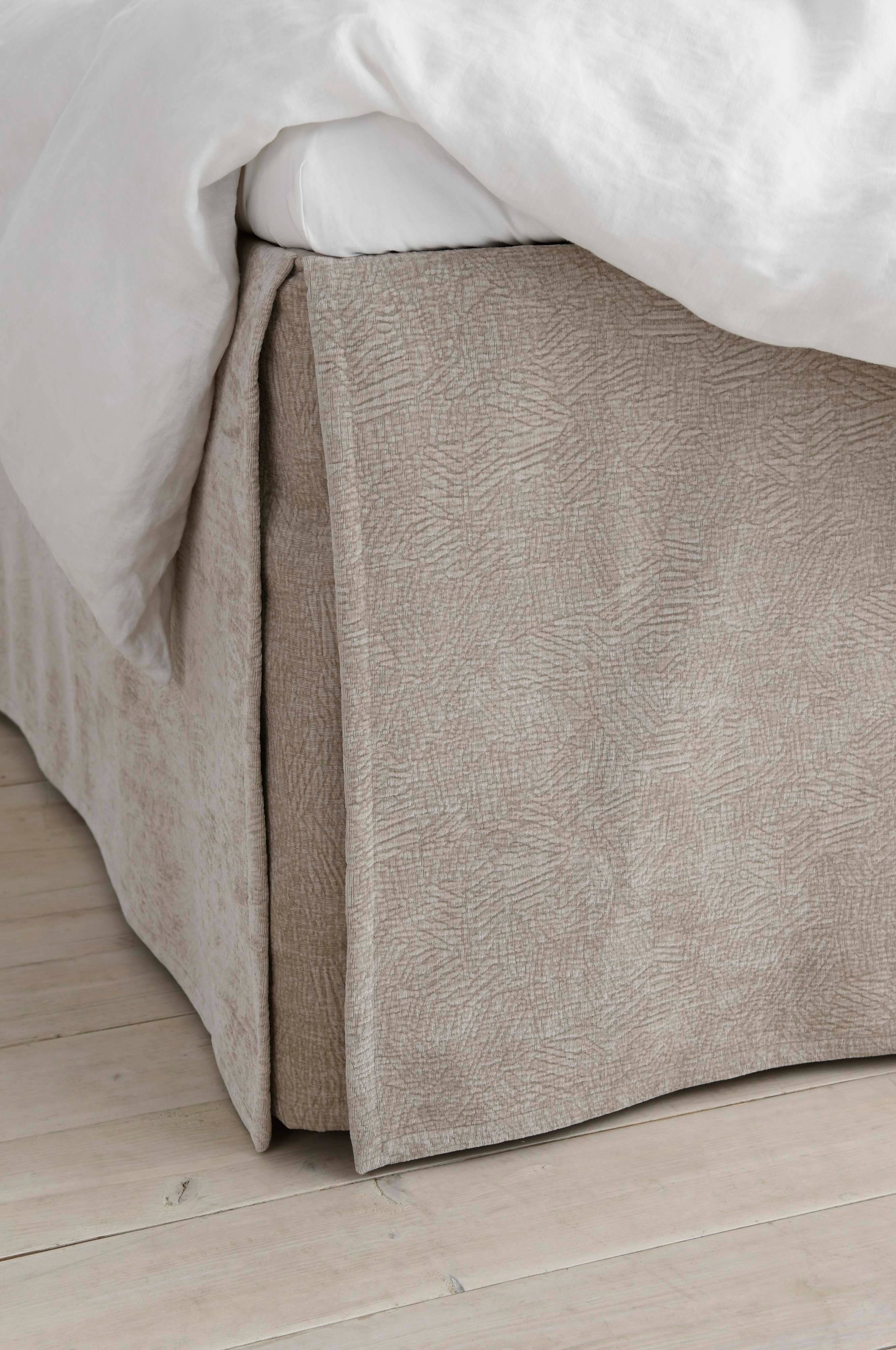 Sengekappe med topp i bomull og kappe i krinklet fløyel med vasket finish. Rett modell med åpne hjørner. Dekorativ, sydd kant rundt nederst. 5 størrelser: 90x200, 120x200, 140x200, 160x200 og 180x200 cm. Høyde 60 cm.