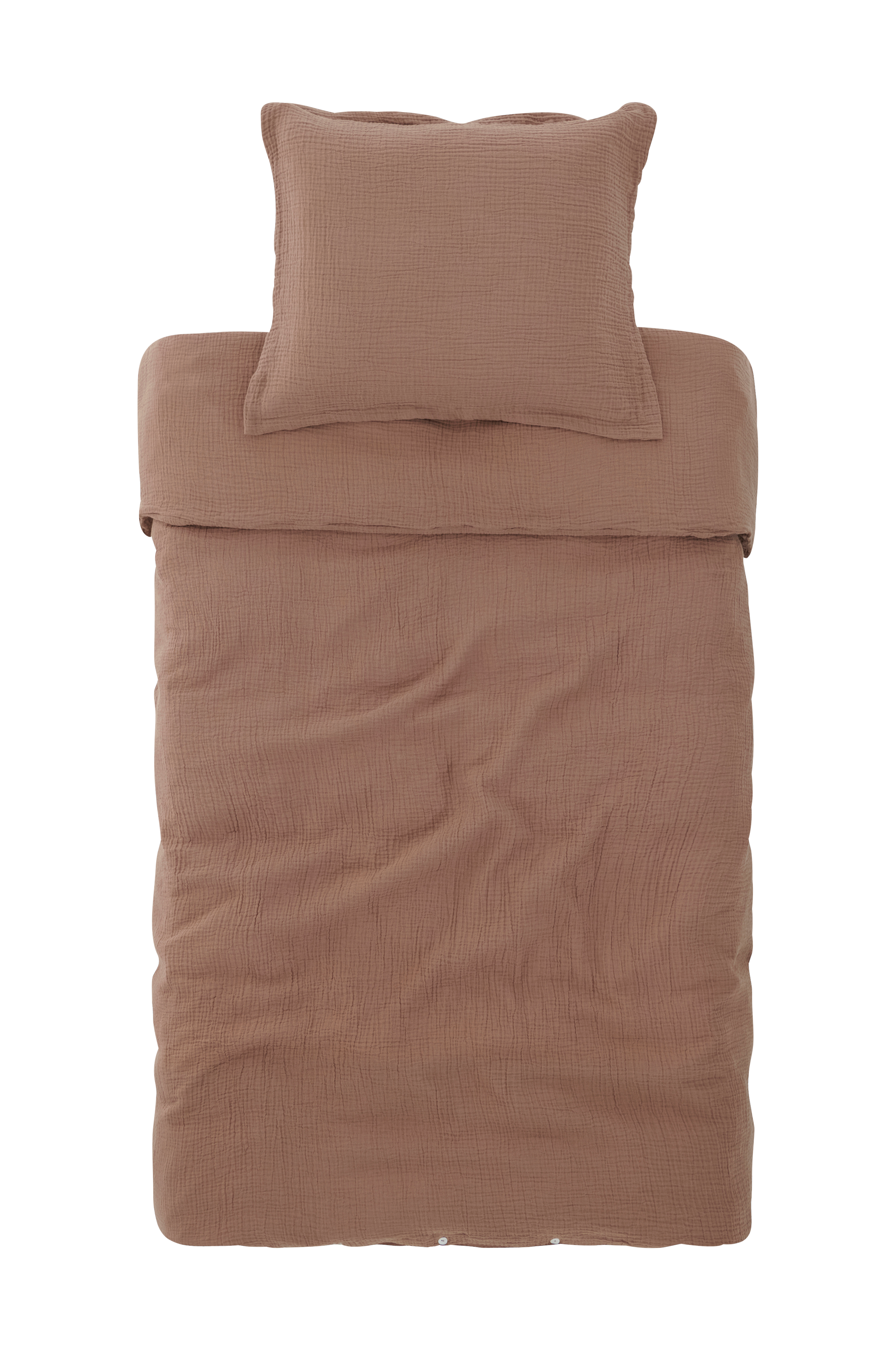 2- eller 3-delt sengesett av vasket, økologisk bomullsmusselin i 2 lag. Dynetrekket har knapper i nederkanten. Putevaret har 2,5 cm vinge rundt. Trådtelling: 230 TC. Musselin er et supermykt, luftig og lett teksturert stoff med den velkjente rynkede effekten.