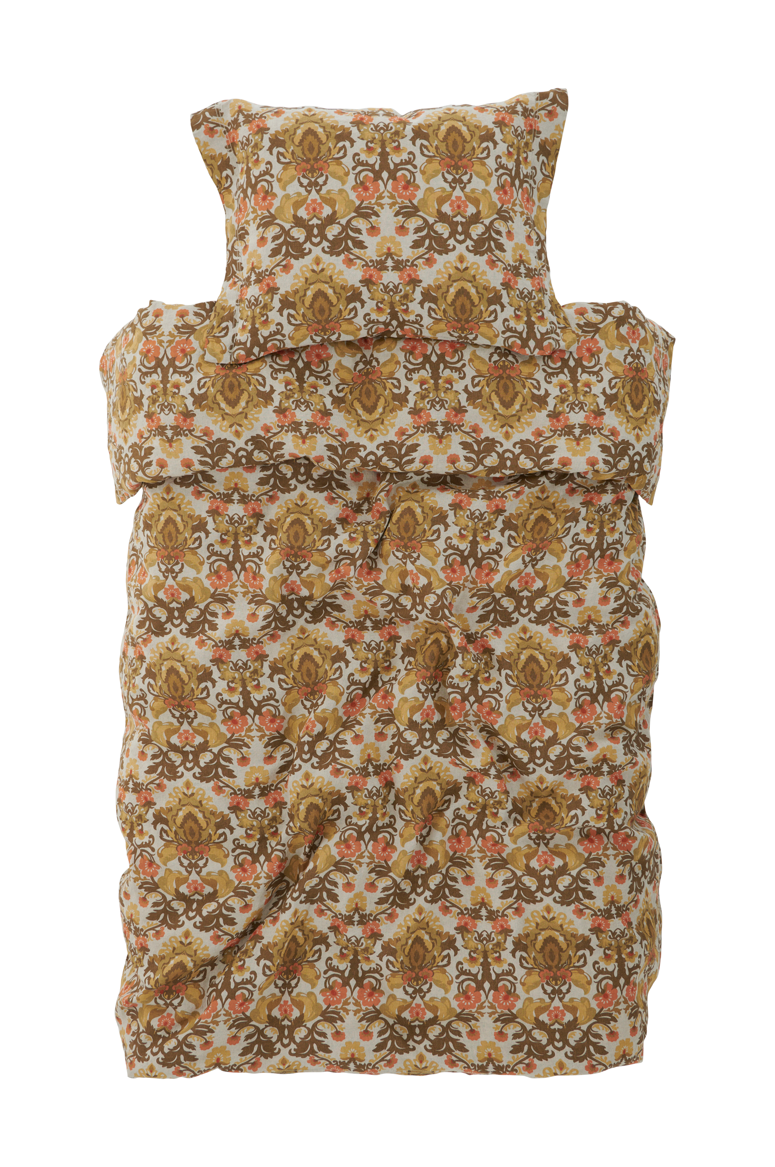 Sengesett i vintagevasket linkvalitet av fransk lin med trykt mønster på synlig linbunn. Dynetrekket har trykknapper i nederkanten. Ingen håndhull. Putevar med 5 cm vinge på kortsidene. Settet inneholder 1 dynetrekk 150x200 cm og 1 putevar 50x60 cm + vinge.