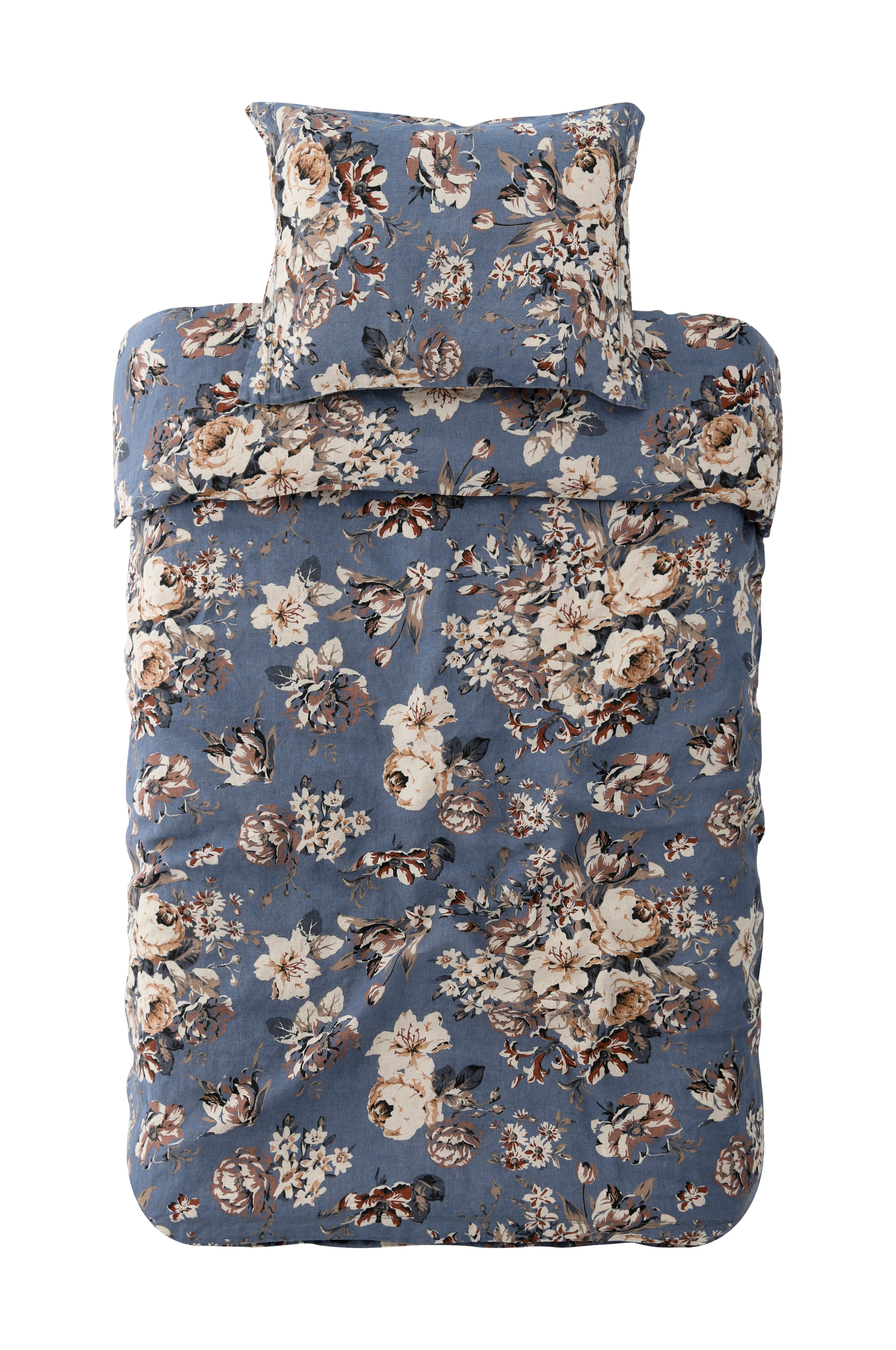 Sengesett i vintagevasket linkvalitet av fransk lin med trykt rosemønster på synlig linbunn. Dynetrekket har trykknapper i nederkanten. Ingen håndhull. Putevar med 5 cm vinge på kortsidene. Settet inneholder 1 dynetrekk 150x200 cm (til enkeltdyne) og 1 putevar 50x60 cm + vinge.