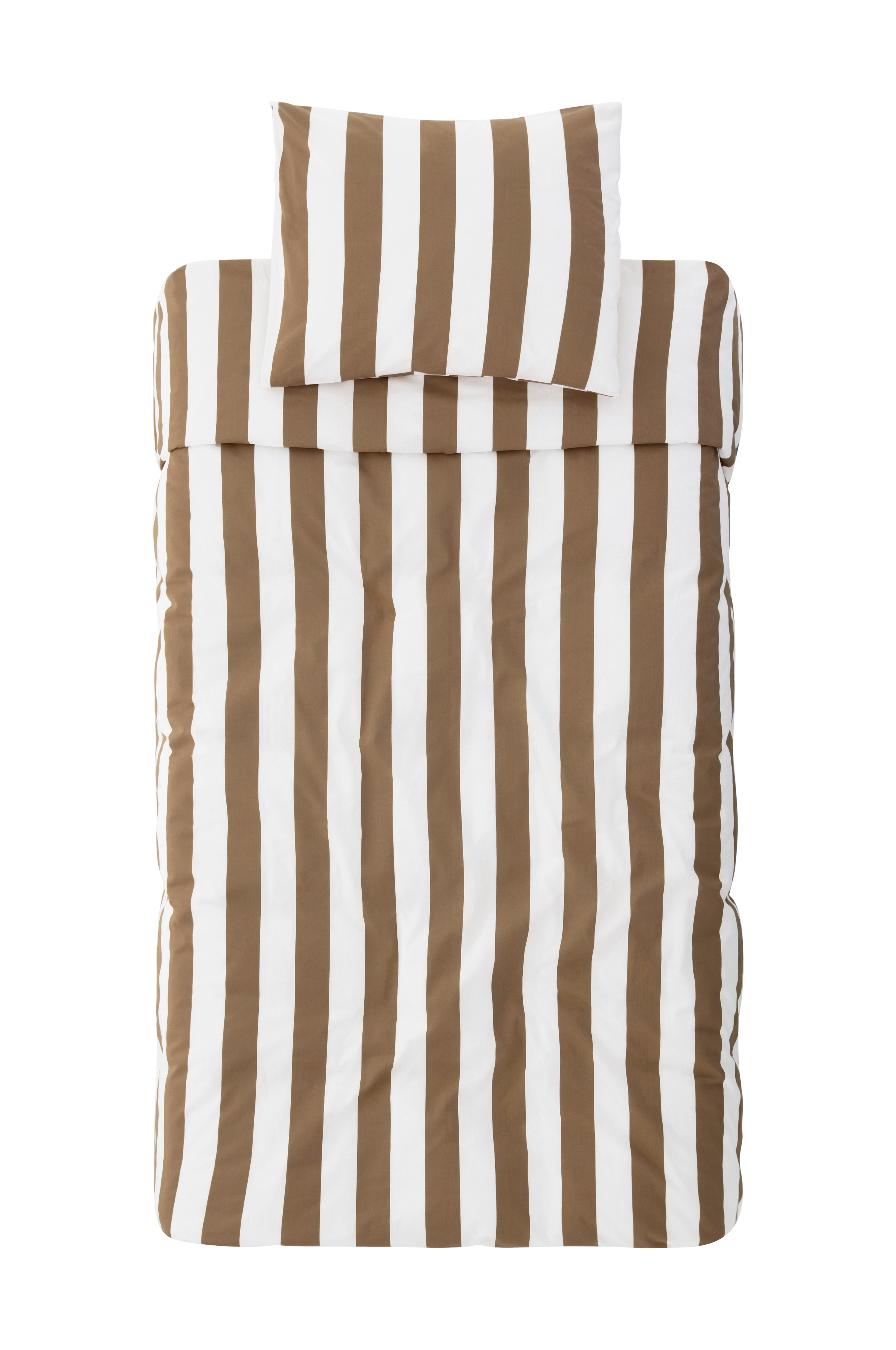 Sengesett i bomull med trykte striper. Trådtetthet 144 tc. Dynetrekk med håndhull. Settet leveres i en stoffpose av samme kvalitet.