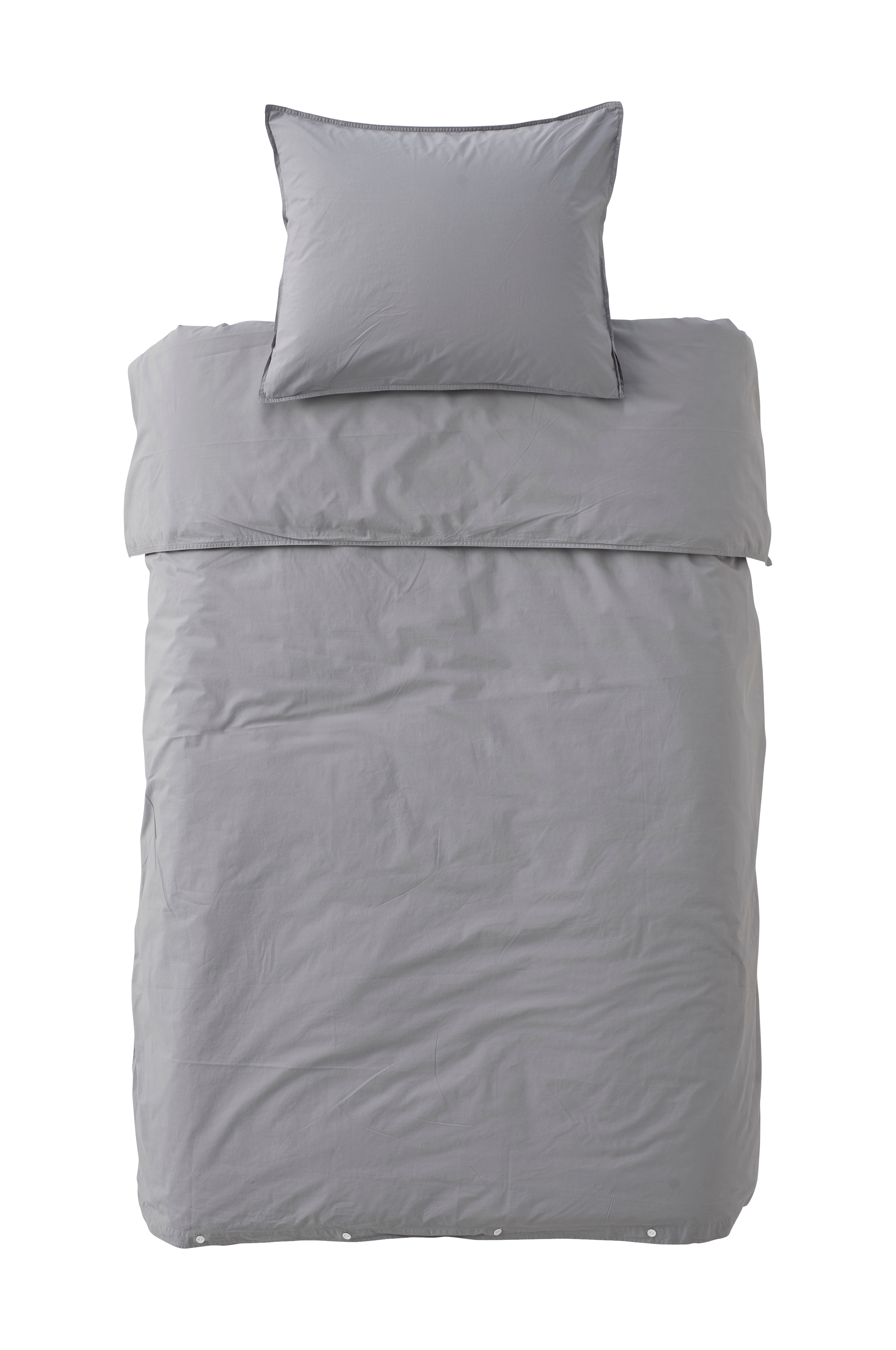 2-eller 3-delt sengesett i vasket bomullspercale med jeanssømmer og gummiknapper i nederkanten på dynetrekket. Trådtetthet 200 tc. Settet leveres i en stoffveske i samme kvalitet.