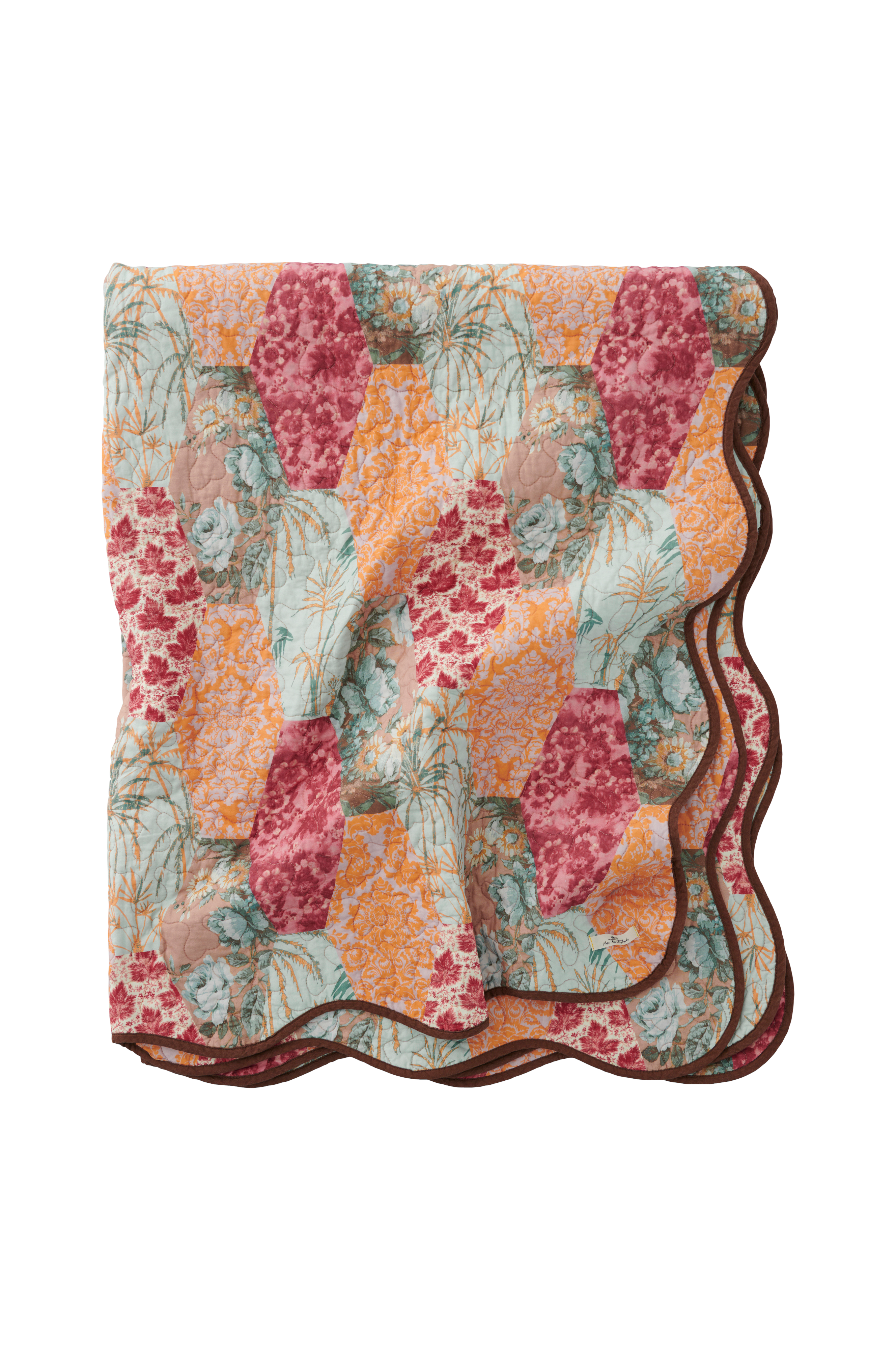 Quiltet sengeteppe i vasket bomull med trykt mønster på for- og baksiden. Buede kanter med ensfarget kantebånd.
