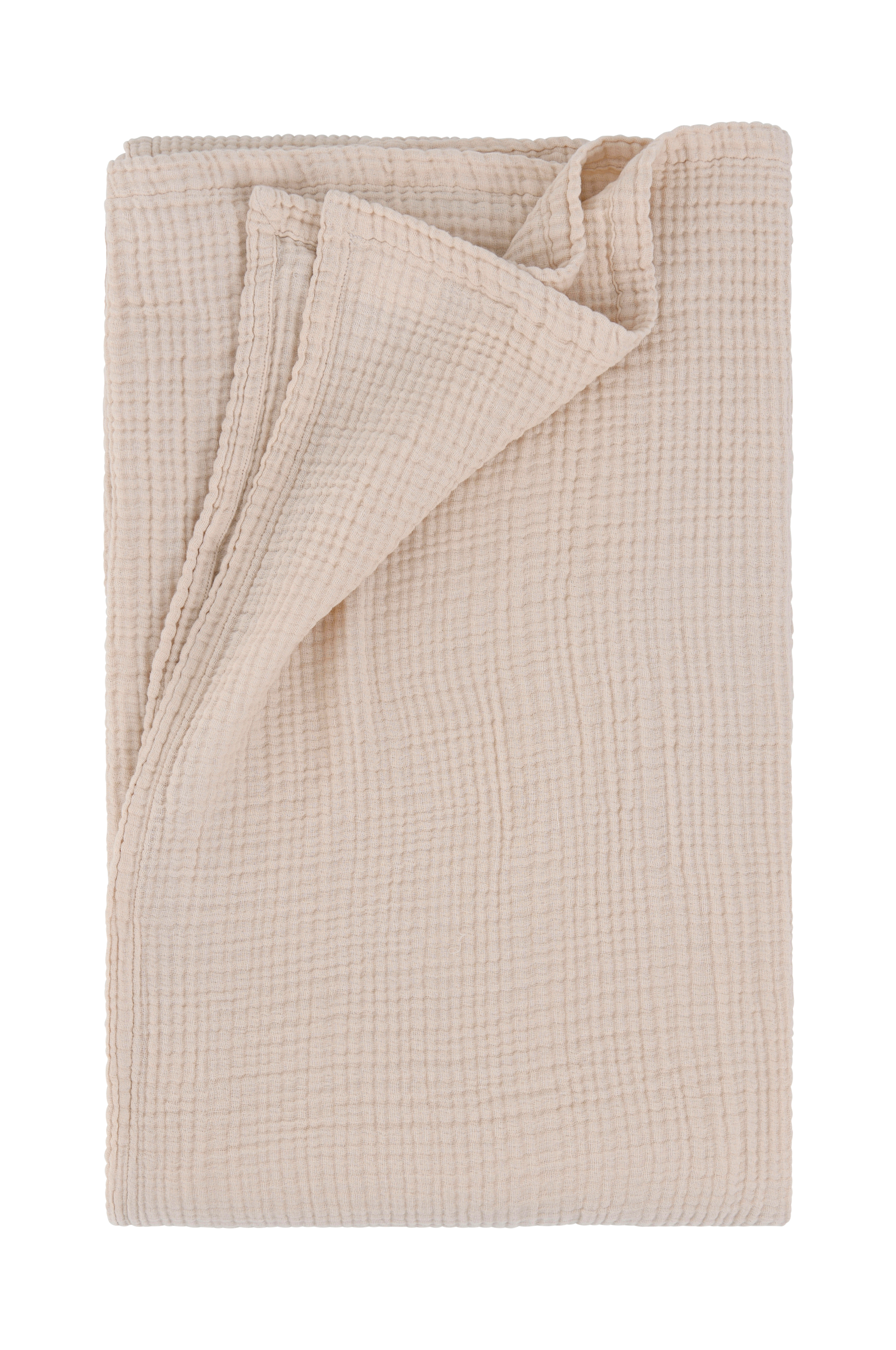 Sengeteppe av økologisk bomullsmusselin i 4 lag. Faldede kanter. Leveres sammenrullet.