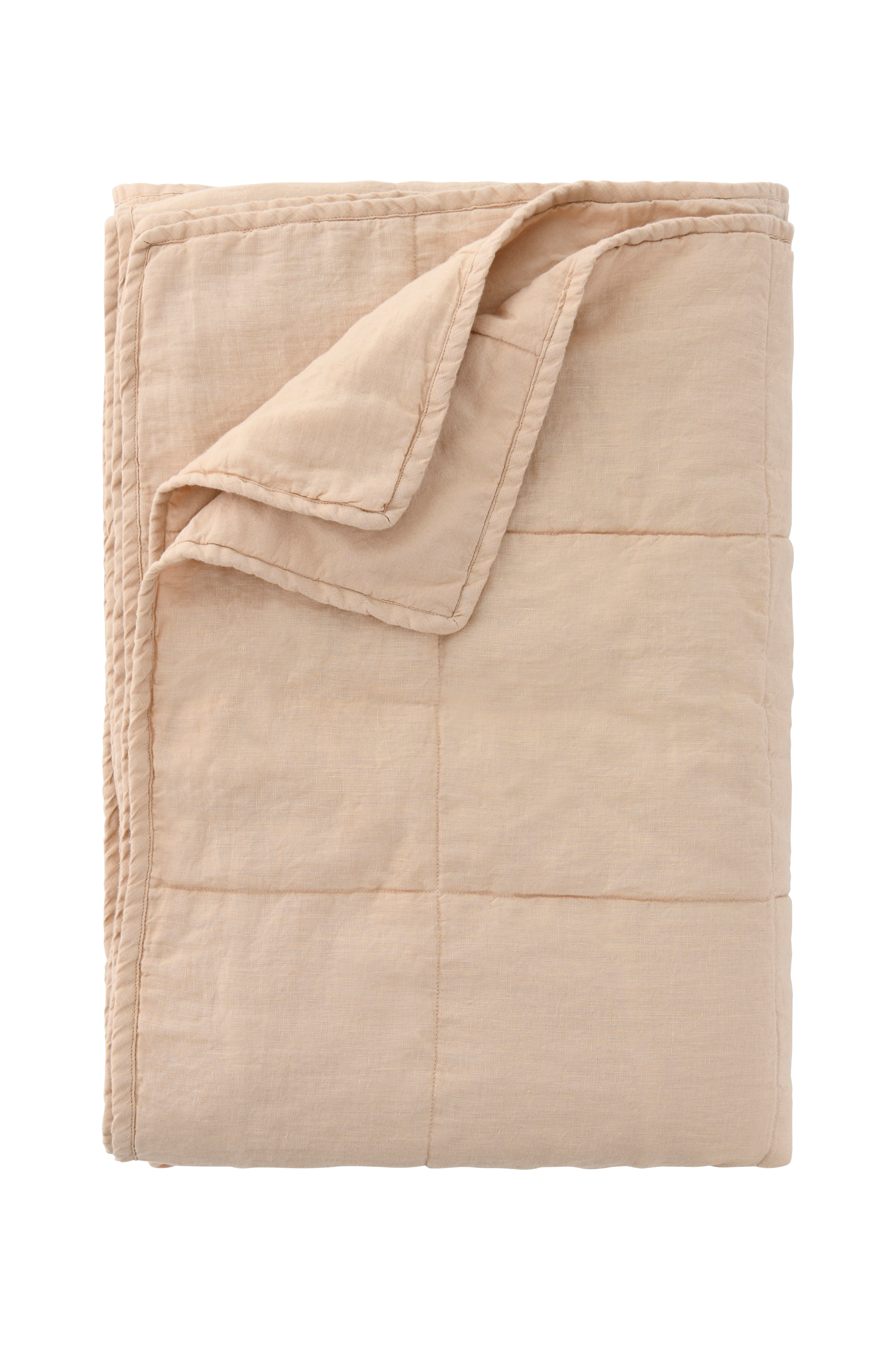 Lett, rutequiltet sengeteppe med forside i vasket lin. Bakside av bomull.