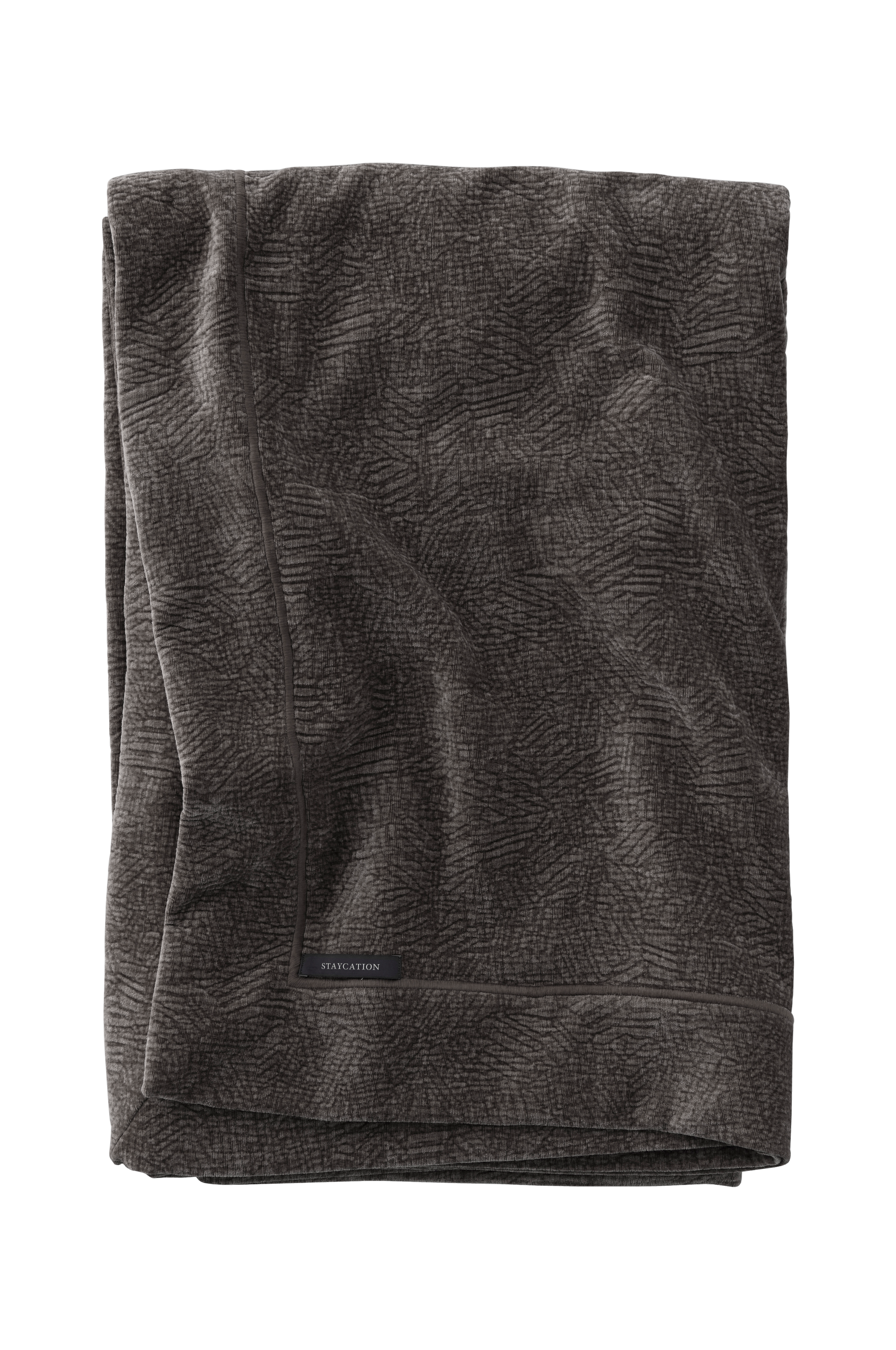 Sengeteppe i krinklet fløyel med vasket finish og fint fall. Dekorativ, sydd kant rundt.