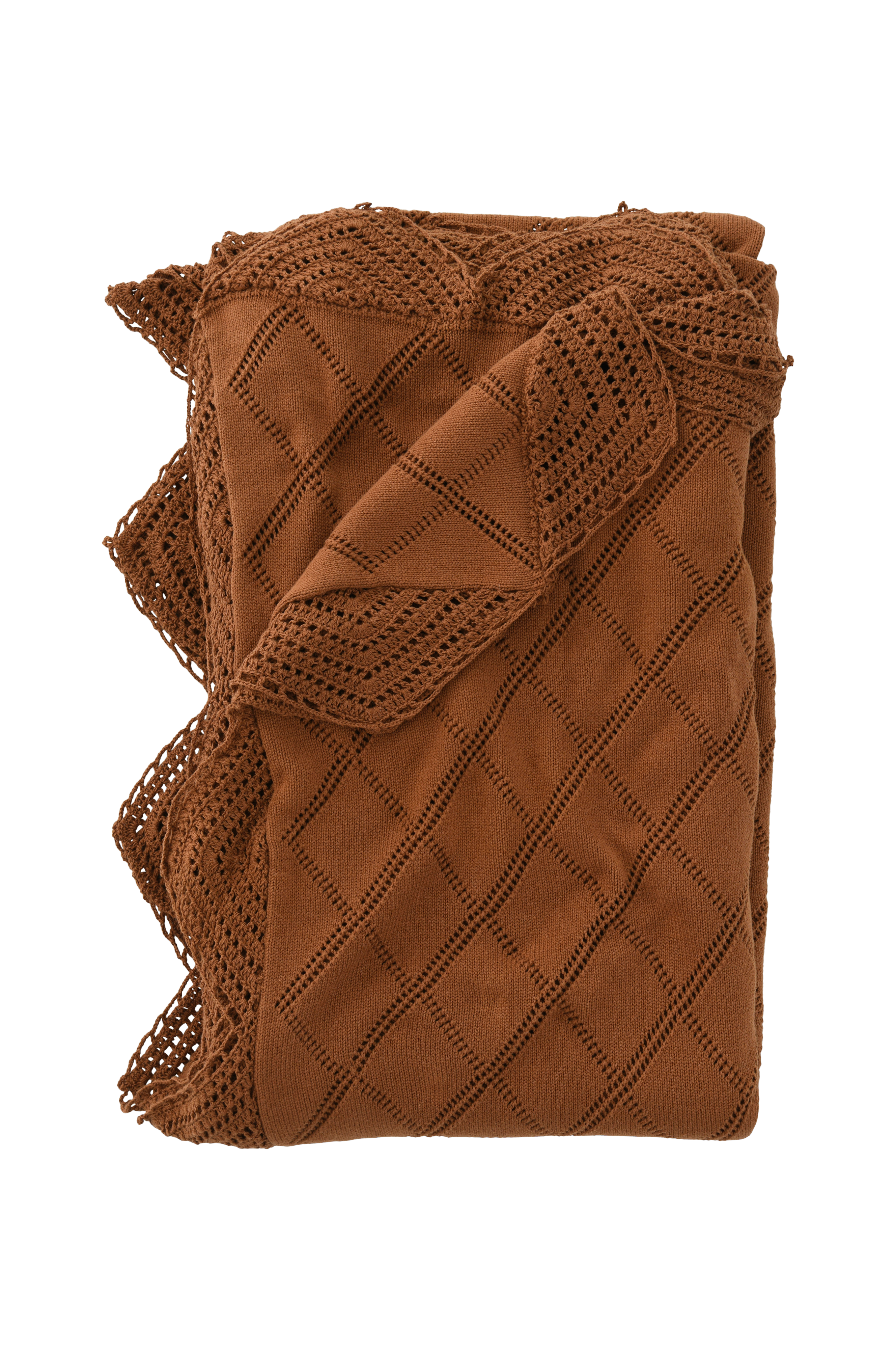 Strikket sengeteppe i vasket bomullskvalitet med heklet kant rundt og brodert mønster.