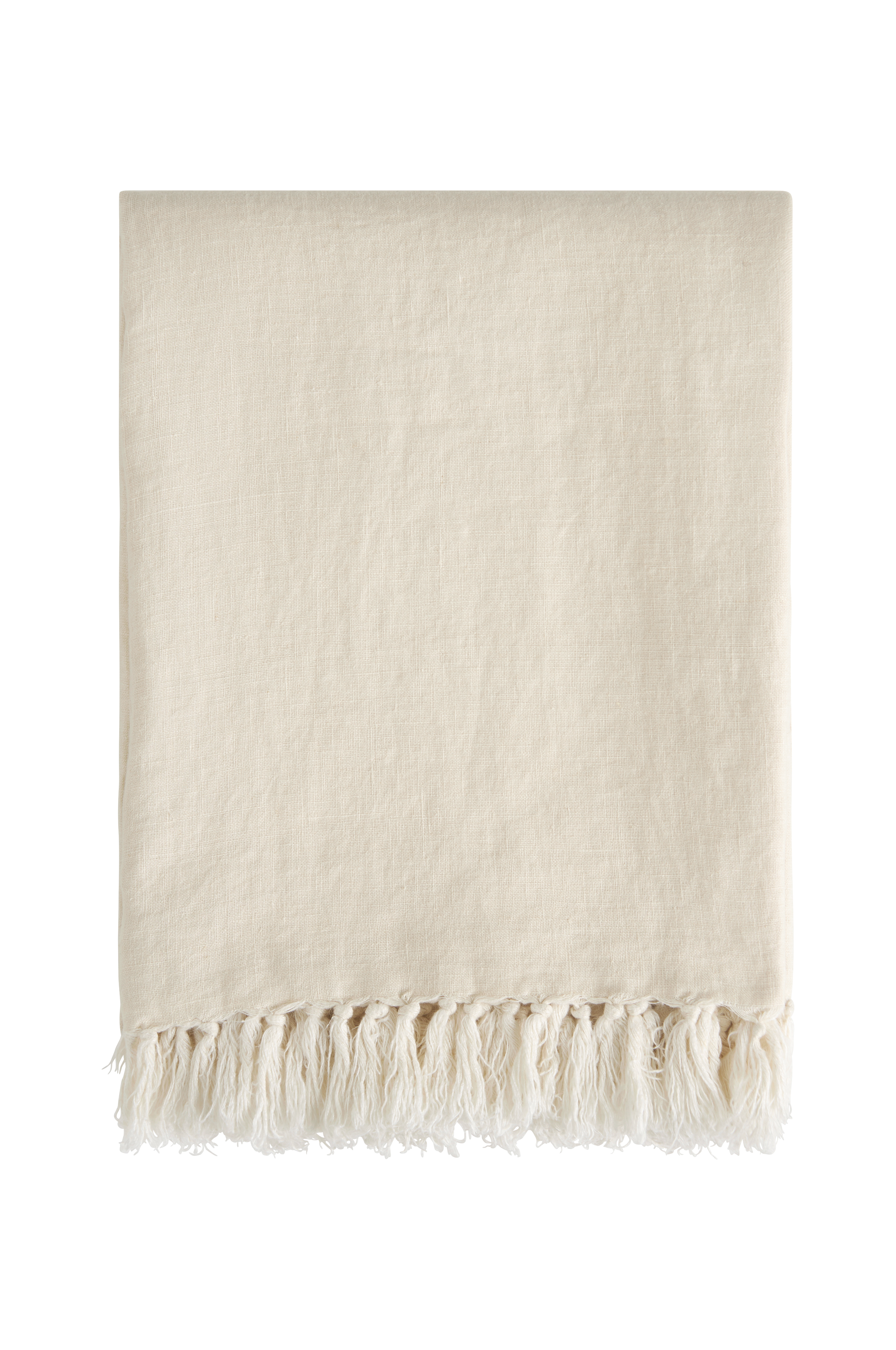 Sengeteppe av vasket, fransk lin i kraftig kvalitet med frynser på to sider. Kan også brukes som pledd.