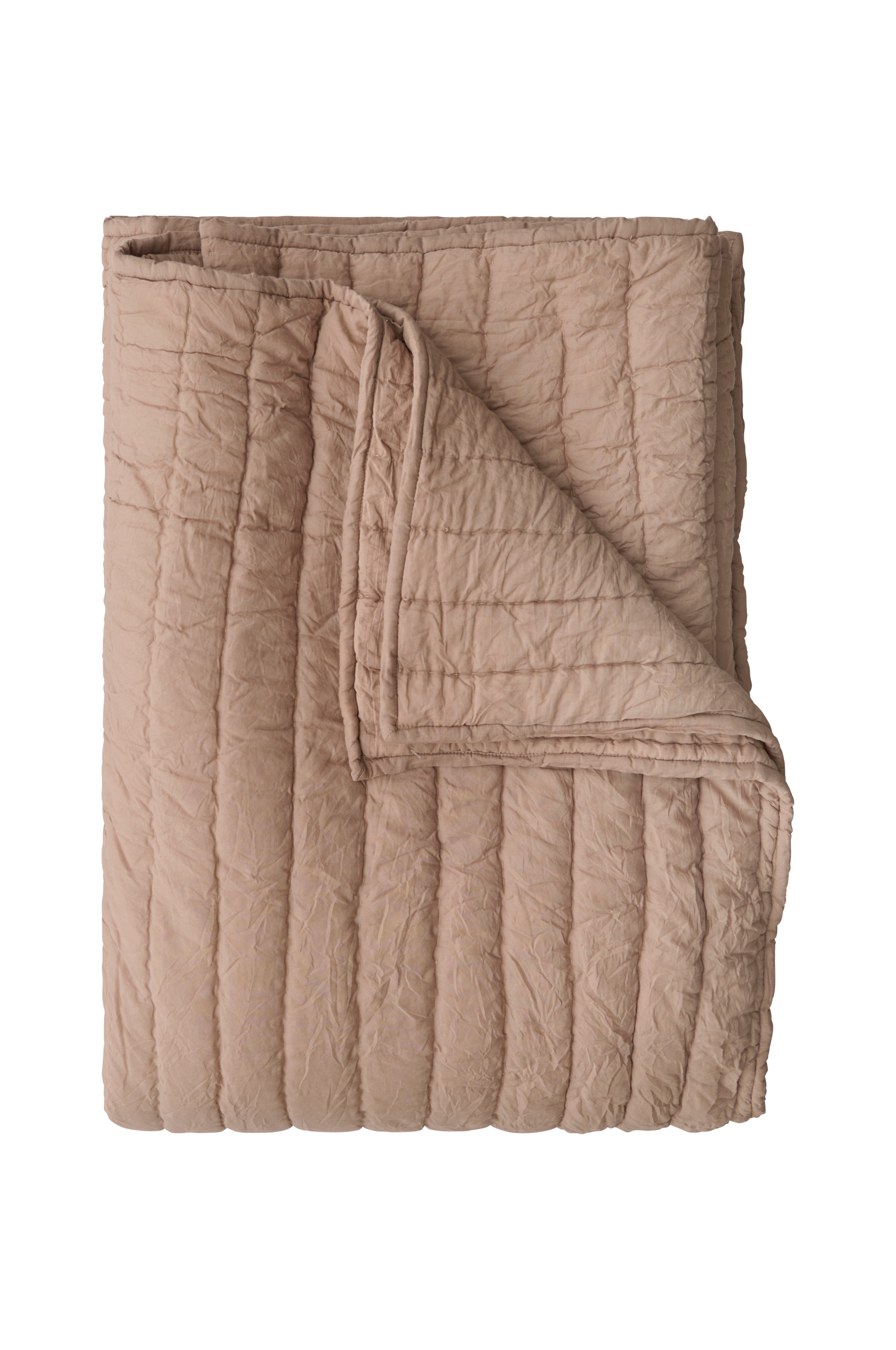 Håndquiltet sengeteppe i myk, vasket bomullsvoile med kantebånd rundt. Fyll av 250 g bomull.