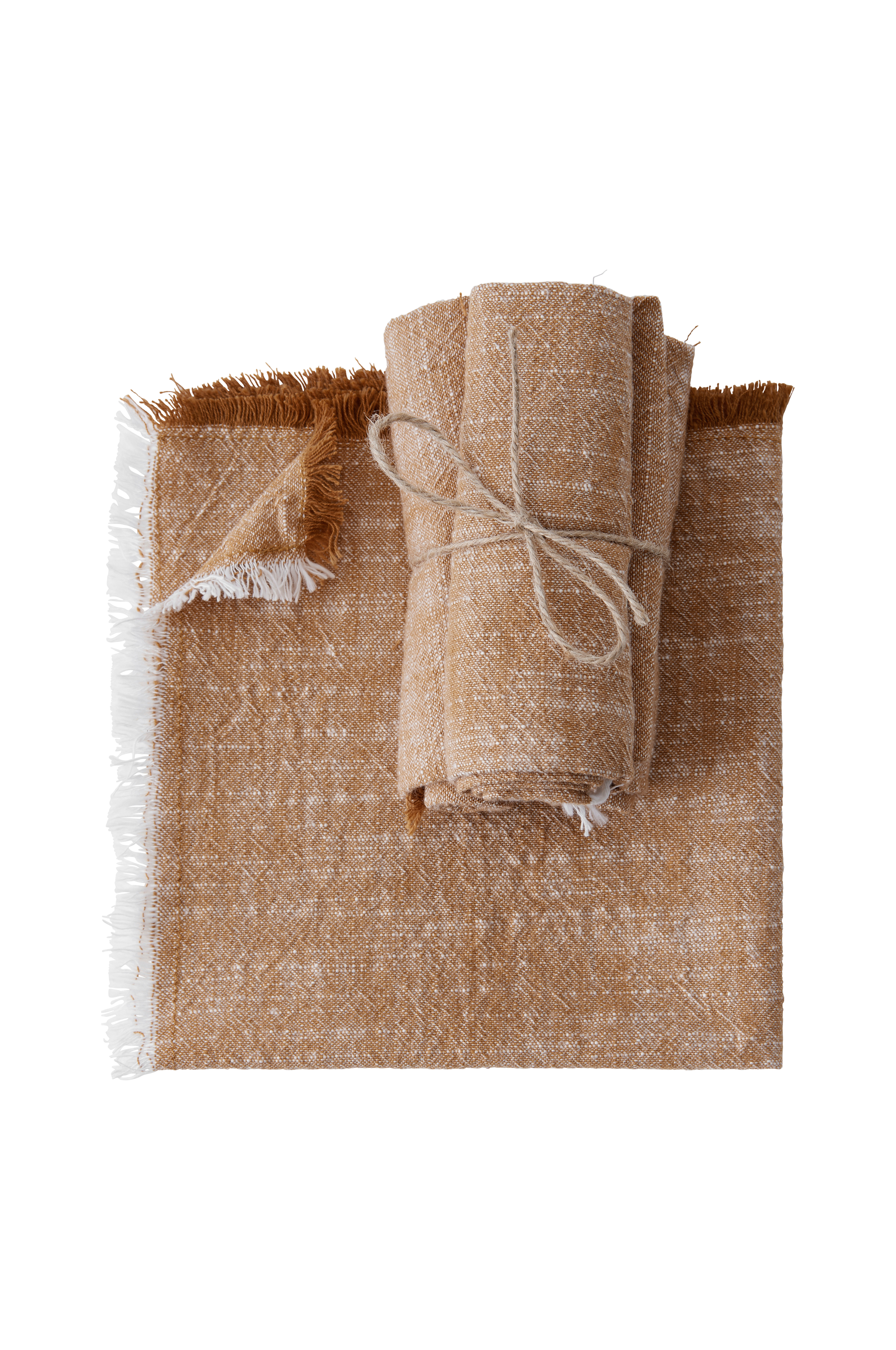 4 servietter i vevd, økologisk bomull med melert farge og slubbeffekt, noe som betyr at stoffet har en lett tekstur. Frynser på 4 sider.